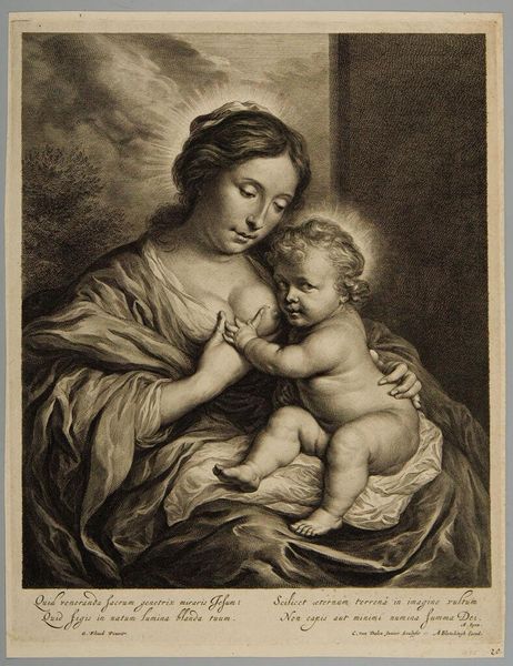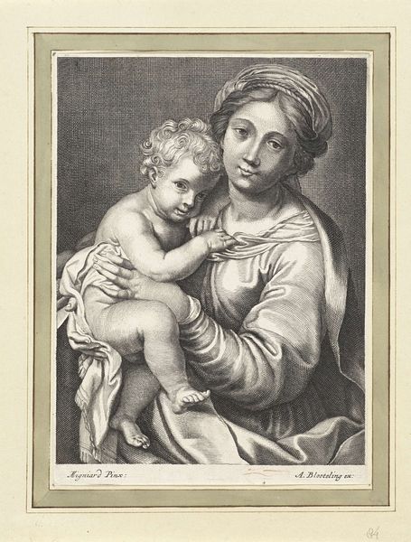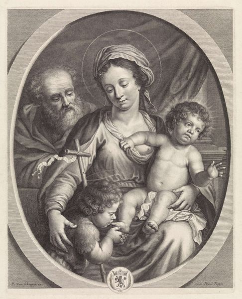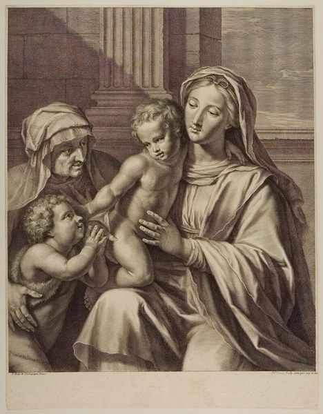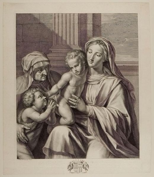 Curator: This is Georg Friedrich Schmidt's "Virgin and Child with the Infant Saint John," housed here at the Harvard Art Museums. Editor: The stark contrast and fine lines create a serene yet subtly unsettling mood. It’s the scale of the figures, filling the frame, that I find most striking. Curator: Indeed. The symbolism is profound. Mary represents divine motherhood, her gaze embodying compassion and wisdom. The infants, Christ and John, foreshadow their sacred roles. Editor: Note how Schmidt masterfully uses chiaroscuro to model form. The interplay of light and shadow across the drapery and flesh creates a compelling visual tension. Curator: The iconography reinforces cultural memory, linking viewers to centuries of Christian art and devotion. The halo, of course, signifies sanctity. Editor: And the composition itself, almost pyramidal, provides a solid, stable structure reflecting the enduring nature of these religious figures. Curator: It's remarkable how Schmidt captures the intimacy and sanctity of the scene through such detailed symbolism. Editor: The formal elements work in harmony, creating a visually arresting interpretation of this classic theme.