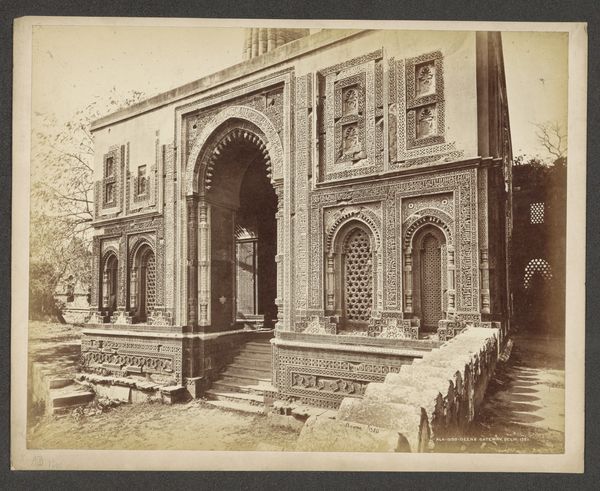 Editor: Here we have "Mannen poserend voor het Perzische huis op de Wereldtentoonstelling van 1873 te Wenen", an albumen print dating from around 1873-1875 by Josef Löwy. I’m really struck by the intricate detailing on the building itself, especially compared to the plain clothes of the figures. How would you interpret the work, given its composition? Curator: The photograph presents a fascinating study in contrasts. Observe the rigorous geometry of the architectural structure against the more organic forms of the surrounding trees. Note how Löwy uses light and shadow to articulate the three-dimensional form, drawing the eye upwards towards the apex of the building. The detailed surface ornamentation suggests a concern with texture and pattern, engaging the viewer in close visual scrutiny. The figures are arranged to define scale and further articulate depth, aren't they? Editor: That’s a really interesting way to look at it. I was so focused on the 'oriental' aspect that I hadn't noticed the formal elements as much. Do you think the contrast between the elaborate architecture and the simplicity of the figures is deliberate? Curator: Certainly. Löwy uses the figures as anchoring points within the pictorial space, acting as visual cues to emphasize the sheer ornate grandeur of the ‘Persian house.’ The subdued tonal range of the albumen print lends the entire composition a subtle, almost dreamlike quality, wouldn’t you agree? It emphasizes the meticulous formal choices apparent in the construction of this image. Editor: Yes, I see what you mean. The limited palette really pushes the texture and shape to the forefront. It is far less 'snapshot' than I initially believed, which adds so much nuance to the work. Thanks for sharing your expertise! Curator: My pleasure. Recognizing these formal aspects refines how we view its historical significance and expands how we interpret it moving forward.