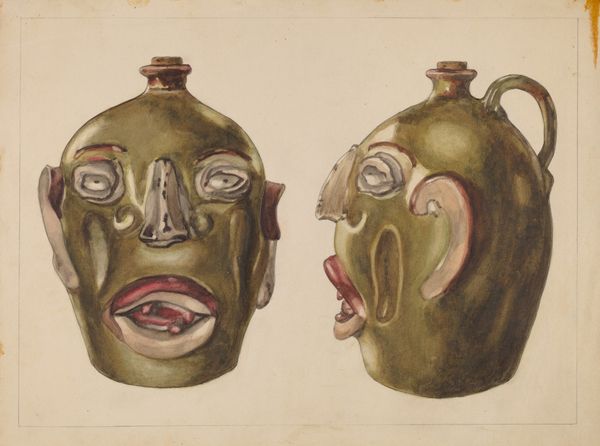 Editor: This is Yolande Delasser's *Grotesque Jug* from around 1936. It looks like a drawing of a ceramic piece. What strikes me is this tension between the domesticity of the jug and the unsettling facial features. What are your thoughts? Curator: Ah, yes! That tension is precisely what I find so compelling. It’s as if Delasser has taken a humble object and breathed a bizarre life into it, wouldn’t you agree? Perhaps even…a satirical one. Are we laughing *with* this jug, or *at* it? Editor: I’m not sure! The jug looks… surprised? Scared, maybe? Curator: Indeed. Notice how Delasser renders the eyes. They’re almost popping out, conveying… well, something other than peace and serenity, eh? Now, imagine having *that* staring back at you over breakfast! The horror, the humanity! Editor: It would certainly make you think. I see the grotesque elements now, particularly in the mouth with its visible teeth and downturned expression. I’m curious about what motivated Delasser to focus on this object in this way. Curator: An excellent question. I think she's poking fun at our perceptions of beauty, you know? Challenging the idea that art must always be pleasing. In this case, the imperfection and strangeness are exactly what makes it interesting. Editor: That's such a good point; reframing the everyday to reveal a hidden layer. I’ll definitely see jugs differently from now on! Curator: Precisely! That little jolt, that slight unsettling, it opens your eyes to the possibilities. The beauty lurking within the absurd, eh? That's the magic of art.