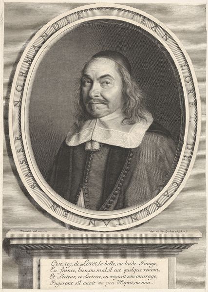 Curator: Here we have Jean Lenfant’s 1661 engraving, “Portret van Etienne Baudrand de Pradel.” It's a fairly standard Baroque portrait, with rich decorative elements, all executed as a print. Editor: Standard is not the word that comes to mind. It’s like staring into the eyes of mild, upper-class contentment… perhaps bordering on boredom? He looks as if he's perpetually stifling a yawn behind that tiny moustache. Curator: I find that rather harsh. Remember the context; these portraits were instruments of power, of social standing. Look at the laurel wreath surrounding him, the family crest, the very deliberate pose… Editor: Oh, I’m sure Etienne Baudrand de Pradel was terribly important! But look closer. There's something almost cartoonish about the exaggerated frame around the portrait and his very wide-eyed, polite expression. It's as if the artist struggled to capture something essential, perhaps a depth that wasn't really there. Curator: Perhaps you are being a bit harsh, but you do have a point about the stiffness. Academic art of the period sought idealisation, but Lenfant's approach reveals the artificiality of the performance itself. It does expose something interesting about the subject. Editor: Right? I see that his clothing gives the impression of status and a high position but also conveys this need for external affirmation; even though he seems bored by it all. What do you suppose Baudrand de Pradel did to be immortalised in print? Curator: Research tells me Etienne Baudrand de Pradel was a lawyer serving in the parlement in Grenoble. These prints would often function almost like promotional material or calling cards. Editor: Ah, so a Baroque business card! He doesn’t look very persuasive. More like someone I’d avoid at a stuffy gathering. Though the man definitely had presence, a well groomed head of hair and nice tailoring that adds sophistication to this portrait. Curator: True, but there is something incredibly compelling about viewing it now. It acts as a historical artifact, revealing social structure and artistic practice within that very specific timeframe. Editor: Indeed. For all my lightheartedness, there is also something deeply fascinating about seeing history presented through a face—however bored it may appear. A window into the past that gives insight into a society that can often feel remote.