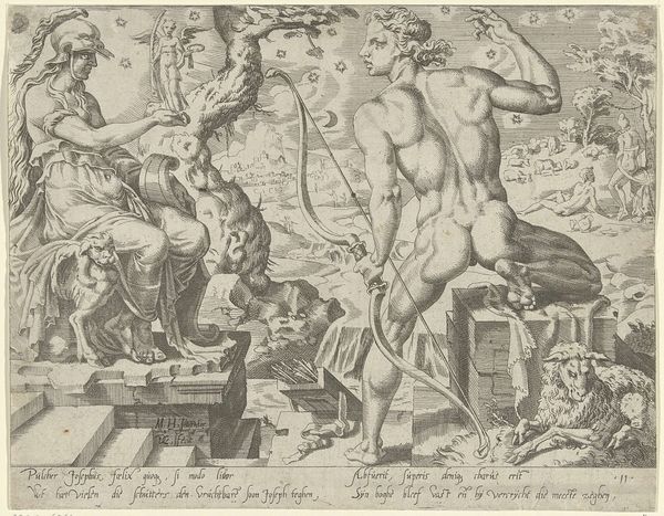 Editor: So, this is "Gad," an engraving by Dirck Volckertsz Coornhert from around 1550. It’s quite striking, with a really dynamic and muscular figure dominating the foreground, set against this chaotic battle scene. It feels very dramatic, almost theatrical. What do you make of this piece? Curator: Theatrical, yes, perfectly said! It’s as though the artist has grabbed a scene from a fever dream and etched it onto copper. Look at that central figure; his back turned to us, yet radiating such power, perched almost precariously. It's like a visual poem about strength, fragility, and the chaotic dance of war, don't you think? I wonder, what is *he* thinking? Editor: I hadn't thought of it as precarious! More dominant. The war scene in the background seems almost secondary to the figure and the animal at his side. Is there a narrative that's being depicted here, or is it more allegorical? Curator: Oh, absolutely a narrative! This is Gad, one of the twelve sons of Jacob, also understood as a personification of good fortune. The image would have spoken volumes to a 16th-century audience familiar with biblical stories and classical allegories. It suggests perhaps that fortune—or misfortune—is inextricably linked to strength and conflict. Editor: So, he’s sort of embodying a concept? It's interesting how Coornhert uses the etching to create such a textured effect, like the fur of the animal beside him. It almost feels like you could reach out and touch it. Curator: The tactile quality is superb! He's teasing the boundary between two and three dimensions, wouldn’t you agree? And precisely! Coornhert’s not just showing us *Gad*, he's inviting us to consider the very nature of fortune, strength, and the havoc they wreak. A good reminder that context enriches our experience. Editor: It’s amazing how much a deeper understanding of the context changes my perspective on the piece. I initially saw just a powerful figure, but now it seems to be such a thoughtful and symbolic statement. Thanks for shedding light on this!
