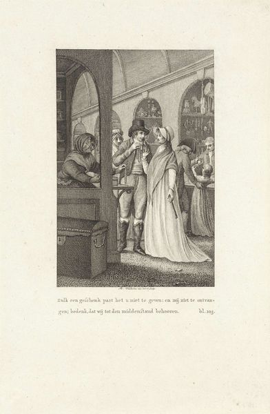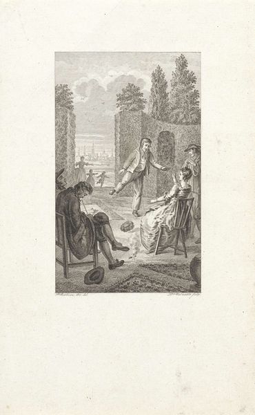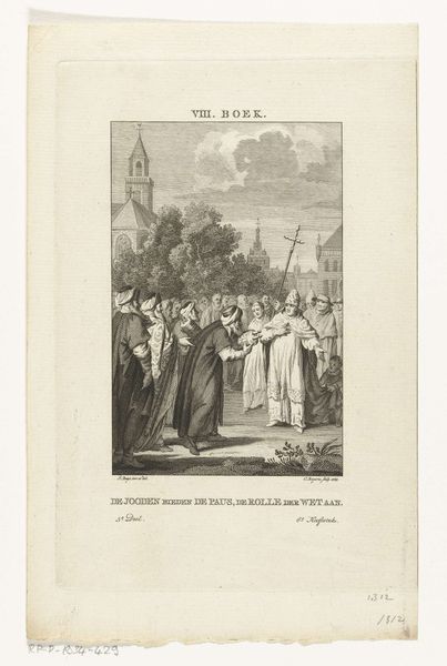 Curator: Here we have Reinier Vinkeles' 1808 engraving, titled "Pope Julius II Throws the Keys of St. Peter into the Tiber." What strikes you about it? Editor: The grayness, initially. Everything sort of bleeds into each other, water, sky, clothing, buildings. Then your eye gradually finds these centers of tension, figures caught mid-gesture in what feels like a really grim story. Curator: Vinkeles was known for his precise and detailed engravings. In this print, we see a dramatic, theatrical presentation, rendered in meticulously worked lines and shading. It is part of the collection at the Rijksmuseum and tells a very specific narrative. Editor: What strikes me is this almost anti-monumentality – I mean, keys being thrown in water. Peter’s keys, the whole foundation of the papacy! Is Vinkeles suggesting that spiritual authority is so much useless metal? Who’s that in the wide-brimmed hat getting rid of them? Curator: Well, that would be Julius II. And you're right; it's an incredibly subversive act portrayed here. He's essentially rejecting the traditional power associated with the papacy and its symbolic inheritance from St. Peter. Editor: All that power, all those symbolic keys boiled down to discarded material. Makes you wonder what other "keys" of power are being thrown away today. I’m fascinated with the social commentary this piece might be making through the materials and symbols. It feels less like glorifying art and more about exposing what drives us. Curator: It’s a fascinating interpretation and I agree; there is definitely more than meets the eye here. Vinkeles’ choice of engraving seems apt somehow, almost echoing the inflexible structures of power he may well be criticising. Editor: Exactly! Engraving—etching away at the power structure itself, layer by layer. Thank you, this was fun! Curator: Indeed! A print provoking questions about the value we place on institutions and beliefs even centuries later is something to reflect upon.