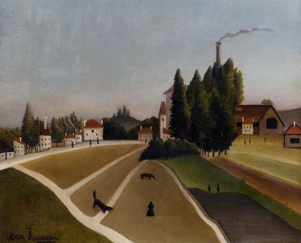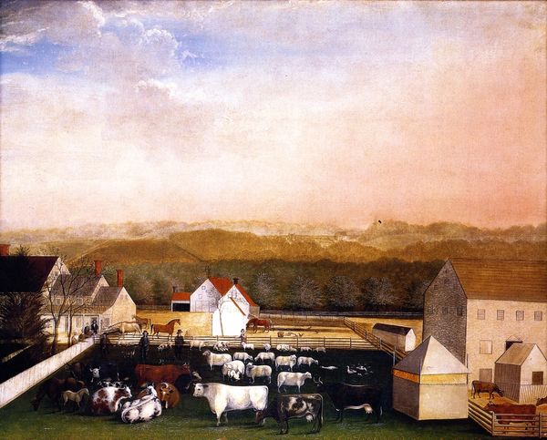 Curator: Looking at this serene vista, I’m reminded of how the Danish Golden Age painters captured the nation’s emerging identity. This piece is titled "View of a Street in Østerbro outside Copenhagen. Morning Light", rendered in 1836 by Christen Købke. Editor: It exudes such quietude, doesn't it? The light seems almost tangible, draping over the houses and softening the figures along the roadside. Those figures and the livestock give the scene a pastoral, idyllic feel, while also evoking powerful senses of memory, safety, and homeliness. Curator: Precisely. Købke was a master of capturing the bourgeoning Danish bourgeoisie. We see everyday life, not idealized but rendered with remarkable clarity and light. Note the almost photographic detail in the architecture, especially in the linear and atmospheric perspectives, which lend it a certain authenticity. The street itself becomes a stage for daily life. Editor: The clouds especially resonate, heavy with symbolism and the memory of Nordic folklore. I notice, also, how Købke uses the image of the livestock moving across the road to connect the buildings, vegetation, and people. Their motion unites, making it all one painting rather than a collection of carefully crafted, individualized, studies. The cows here also likely symbolize pastoral ideals and domestic prosperity, harking back to ancient notions of wealth and harmony. Curator: You touch on an important point. He paints not just the street, but a social landscape. He represents Østerbro at this specific moment in time, and he’s demonstrating Copenhagen's societal development during Denmark’s cultural and economic restructuring. And, in capturing these ordinary scenes, he’s creating a sense of shared cultural identity. The cows do become cultural symbols, too, demonstrating the society’s economic dependence on agriculture and local animal produce. Editor: This all brings a feeling of profound calmness. It is the sort of image one returns to, almost involuntarily, as one reflects upon Denmark's and Copenhagen’s deep-rooted and complex history. Curator: Exactly. It's a picture that is so quietly powerful, and a snapshot into Danish history. Editor: The painting quietly draws us into its pastoral narrative, prompting us to meditate on our relationship with domesticity, landscape, and memory.