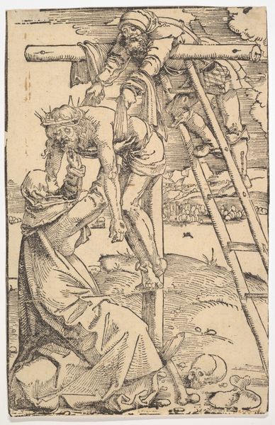Editor: This engraving, "The Descent from the Cross," by Albrecht Altdorfer, from around 1515, feels incredibly immediate, despite depicting such a monumental scene. It's not painted, it's engraved, which somehow makes it rawer. What strikes you most about it? Curator: I’m drawn to the material conditions of its creation and its reception. Think about the process: the labor-intensive act of engraving itself. The artist physically gouged lines into a metal plate, creating a matrix. From this, prints could be made, commodities circulated within a developing market. The means of production informed not only the image, but its dissemination. Editor: That's fascinating. It almost makes it sound mass-produced, yet each print would still retain the trace of that initial, very physical act. Did this impact its cultural significance? Curator: Precisely. This wasn't simply about disseminating a religious image. The reproducibility inherent in printmaking challenged the exclusivity associated with painted altarpieces, expanding access to art and potentially altering the consumption habits of the audience. Consider the skill required versus other media like woodcuts and whether or not Altdorfer created his prints himself or outsourced some of the work. Editor: So, understanding the physical act of creating the work, from the engraving to its distribution, opens up a whole new way of interpreting its meaning and purpose in its time? Curator: Absolutely. It shifts the focus from the purely spiritual to the social and economic factors that shaped its creation and consumption, giving the artist power in a time where printed images spread novel perspectives more easily. Editor: I never considered approaching it from this angle before! I appreciate understanding its material context, beyond just the religious scene represented. Curator: Exactly, seeing art through the lens of material and production can reshape our understanding entirely.
