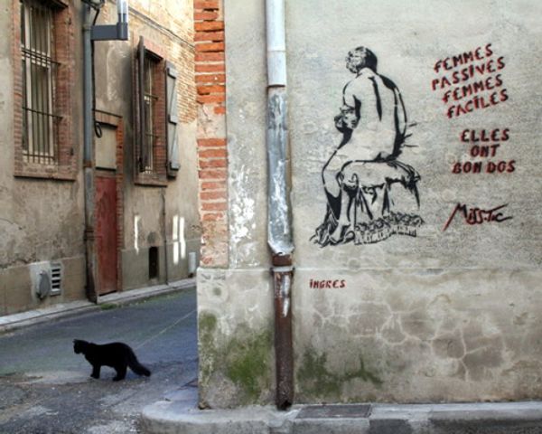 Editor: Here we have "Haring Dog" by Banksy. It's a street art piece, probably spray paint on a wall. The stark black and white imagery really grabs you; it feels both playful and a bit…menacing, somehow. What's your interpretation of this work? Curator: It certainly holds contrasting symbols, doesn't it? Consider the figure of the man, anonymous in a hoodie, yet undeniably present. He holds a chain connected to a dog rendered in a style reminiscent of Keith Haring. This bold line work often signifies joy and immediacy, however the faceless man juxtaposes against the symbol. Do you notice the expression radiating off the dog, Editor? Editor: Yes! It’s almost cartoonish – energetic lines to show barking, an open mouth… definitely feels joyful, especially compared to the person holding the leash. Curator: Indeed. The joyous and explosive energy of the dog, drawn with clear inspiration from Haring’s iconic style, could symbolize uninhibited expression or even a primal energy. Yet, it's restrained by that chain, held by the almost sinister figure. It begs the question: What societal forces, what hidden figures, control and tame our most vibrant selves? Does it speak to contemporary culture? Editor: Wow, I hadn't thought about it that way. It's more than just a funny street art piece. It suggests tension. It feels almost critical of hidden power. Curator: Precisely! This piece speaks to memory and how images function in the cultural psyche, referencing another artist while critiquing societal issues. Symbols like these, juxtaposed intentionally, activate our cultural memory. Art then turns into societal commentary. Editor: I’ll never look at street art the same way again. I didn't realize how much cultural information could be packed into one image. Curator: These are layers and meanings, and understanding them offers so much depth to a piece, regardless of where you encounter it!