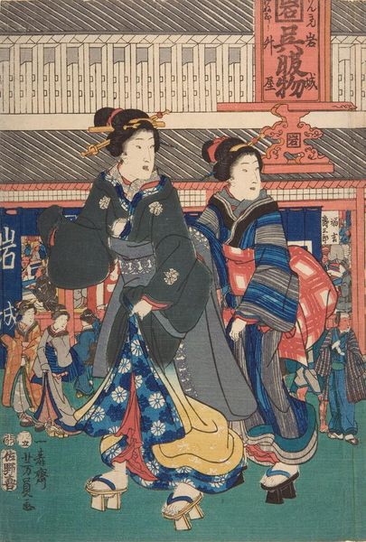 Editor: This vibrant triptych, "Street Scene with Geisha and Courtesan," was created by Utagawa Yoshikazu. It's teeming with life, but there's a stillness to the figures. How do you interpret this seemingly contradictory mood? Curator: It’s like a snapshot, isn’t it? Yoshikazu captures a fleeting moment, yet the woodblock medium lends a sense of timelessness. Perhaps it's about the performance of everyday life, the geisha and courtesan embodying elegance amid the city's bustle. What do you think? Editor: That makes sense. I was so focused on the figures, I almost missed how dynamic the whole scene is! Curator: Exactly! It’s a delightful paradox. We’re left pondering the interplay between the individual and the collective, the ephemeral and the eternal.
