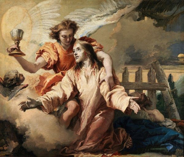 Editor: This oil painting appears to portray a biblical scene, titled "The Visit of the Angel to Zechariah" by Luis Paret y Alcázar. It’s quite striking, with dramatic lighting and a theatrical composition. It really feels like a stage production. What do you see in this piece? Curator: This is an interesting example of Baroque art and the politics of imagery. History paintings were popular during that period, used to reinforce societal norms and the powers that be. You noticed its theatrical quality - does it strike you as honest? Editor: No, it does seem rather idealized and staged, a bit artificial perhaps? Curator: Exactly. Paret's decision to depict a divine moment in such a pompous way reveals the entanglement between the church and the monarchy in Spanish society. How do you see this reflecting in his technique? Editor: Well, the use of rich colours and grand architectural elements seems to glorify the scene, elevating it to something almost superhuman. Like they’re performing for someone else. Curator: Precisely! Paret presents religious power as an undeniable and majestic force. It invites viewers to question the role of art in reinforcing social structures and conveying political messages. Can we detach it from its time and space? Editor: I don't know... Maybe we can now with a critical eye, understanding its history, but for its contemporary audience, that critical distance was much harder to obtain. Thank you. It gives a better perspective of the time the artwork was produced. Curator: My pleasure! Analyzing art this way gives a voice to what might have been silenced, helping us understand and evaluate visual messaging throughout history and now.