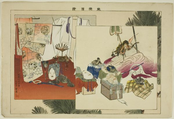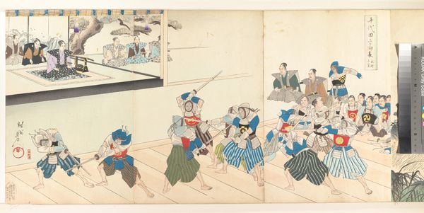 Curator: I find this 1860 woodblock print, "Foreigners Enjoying Themselves at the Gankiro Teahouse" by Utagawa Yoshiiku, so striking. There’s almost a raw, unfiltered energy to it, wouldn’t you say? Editor: It's visually dense, isn’t it? All these layers – the people, the fans, the teahouse architecture – create a palpable sense of cultural collision and observation. I'm immediately struck by the power dynamics at play. Curator: Ah, power dynamics. Tell me more. Editor: Well, here you have this vibrant snapshot of foreigners in a Japanese teahouse. Yoshiiku presents us with these figures "enjoying themselves," but the piece is undeniably mediated through a Japanese gaze, complete with stereotypes about the *gaijin*, their boisterousness, their fashions. Are they truly "enjoying themselves", or are we being shown how different they are from the local people? Curator: That tension, that uncertainty, is exactly what captivates me! The scene unfolds almost like a play within a print, with each figure embodying a distinct role. The foreigners in their loud Western dress are contrasted against the more demure attitudes of the geishas, making a visual, palpable clash. Editor: Absolutely, and I find myself questioning the space these foreigners are occupying. Are they honored guests or spectacles? And to what extent is their "enjoyment" commodified and consumed by the Japanese patrons, maybe as something titillating to watch and judge. Curator: The artist seems less judgmental and more playfully observant. See the slightly exaggerated postures, the comical expressions—it's as if Yoshiiku is gently poking fun, like a playful jab rather than a full on strike. Editor: Perhaps. But I think even gentle poking serves a purpose in reinforcing established views and in delineating difference. Who are they serving by this scene, after all? The domestic audiences or the imagined perception that westerners have on their trip. Curator: A good question! And of course, we look at this today with our contemporary eyes, ever alert to questions of representation. Maybe Yoshiiku wouldn't mind that we are having this debate about his piece 160 years later. Editor: Exactly. This image acts as a time capsule. It invites us to reflect not just on that moment of contact, but how cultural encounters continue to be depicted, framed, and understood even today. Curator: Ultimately, it’s a mesmerizing peek into a pivotal moment in Japanese history. So many possibilities.