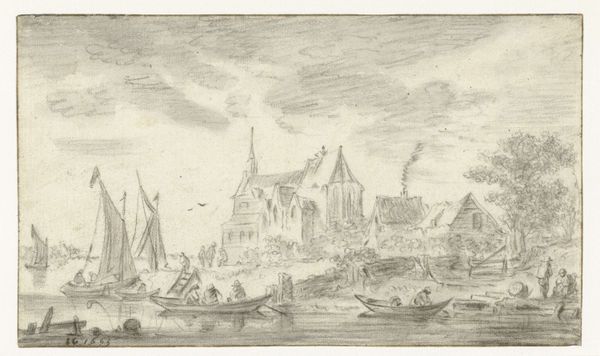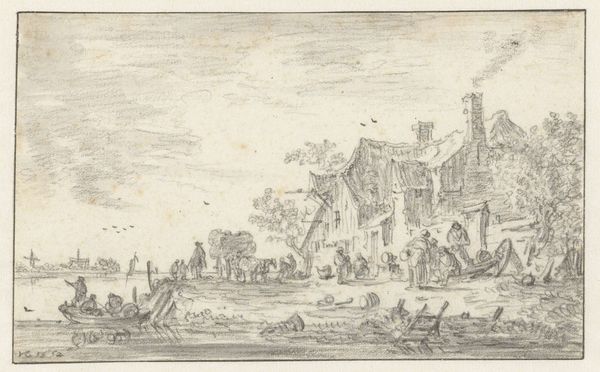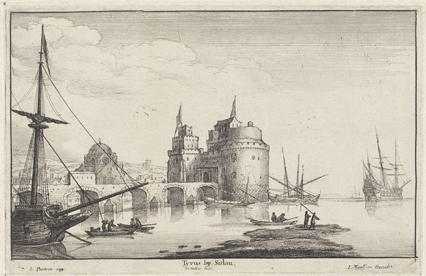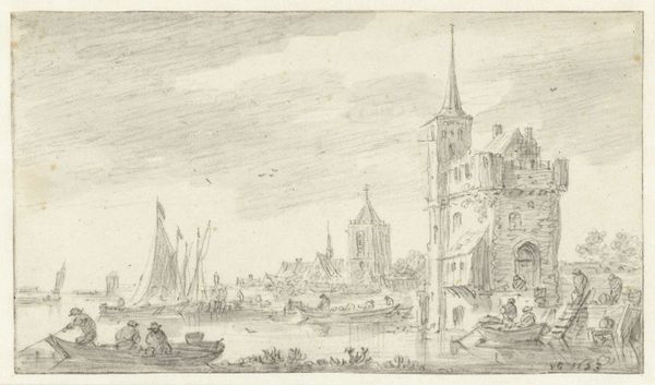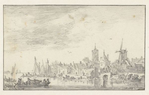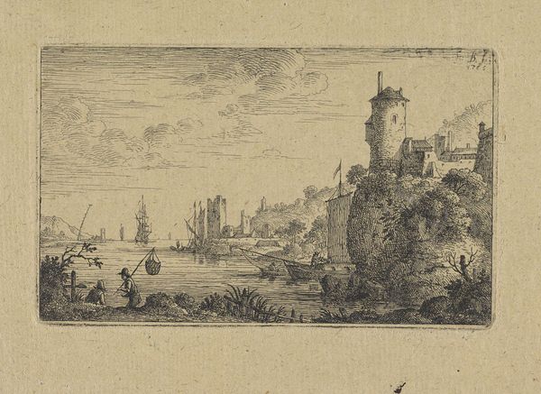 Curator: Looking at Anthonie Waterloo's etching, "City Wall Seen from the Water," I find myself strangely drawn to its melancholy atmosphere. Editor: Melancholy is the word! It’s incredible how such simple lines, just strokes of an etching needle, can convey that mood. I mean, look at those weathered stones, that rickety crane… there’s a definite sense of something decaying. Curator: Indeed. And Waterloo, known for his landscape scenes during the Dutch Golden Age, really captures the texture and form through light and shadow in this print. The Rijksmuseum places it as possibly dating anywhere from 1630 to 1682, which makes you wonder what specific historical moment he was trying to depict. Editor: I find myself imagining this not as a grand fortress, but rather an obsolete defense. It seems like a relic already, and yet daily life – ducks swimming, someone working the crane – is just going on. It’s a fantastic intersection of public works and nature. Curator: Exactly! It's not about glorifying military power. Rather, the focus is on how cities, and even their fortifications, become integral to the landscape and civic life. Notice how he plays with depth, pulling you into the vista, even hinting at open countryside beyond the city wall? It emphasizes the town's connection to the wider world. Editor: And speaking of technique, that’s what gives the whole piece its captivating appeal. Those precise yet slightly chaotic lines mimic the real decay they depict. And he is brilliant at drawing my attention with the reflections of water in this piece. Curator: It's quite a moving portrayal, really, reflecting on how infrastructure, like those city walls and waterways, inevitably soften and surrender to time. And to me this little snapshot into the past serves as a gentle reminder of how connected we are to our history and surrounding world. Editor: Yes, definitely makes you think, doesn’t it? This city wall is a barrier, a point of connection, and, now captured in this small print, a source of endless contemplation.