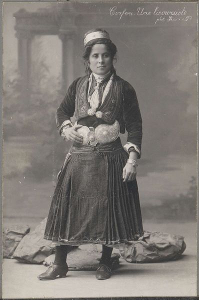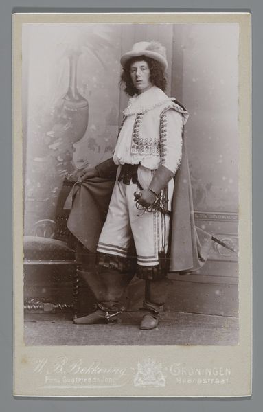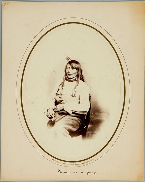 Curator: There’s a quiet dignity in this vintage photograph. It depicts a Native American man, possibly named Grey Bear, in traditional dress. F. Jay Haynes captured this image, though the exact date is unknown. Editor: It’s striking how the sepia tones lend a timeless quality, almost as if he’s emerging from the mists of history. But there’s a real melancholy too, perhaps hinting at the struggles of his people. Curator: Haynes, though a skilled photographer, often worked within a problematic historical context. These images were often used to exoticize or even romanticize Native American culture, reinforcing stereotypes. Editor: I see your point. Still, look at the detail in his clothing—the textures, the subtle patterns. It speaks of a rich cultural heritage, whether or not the photographer fully grasped its nuances. Curator: Indeed. What strikes me is the tension between the staged setting and the man’s direct gaze. Is it defiance, resignation, or simply patience? Editor: It’s a question that stays with you, isn’t it? A single image holding so many untold stories. Curator: Precisely. I think it's a photograph to consider thoughtfully.