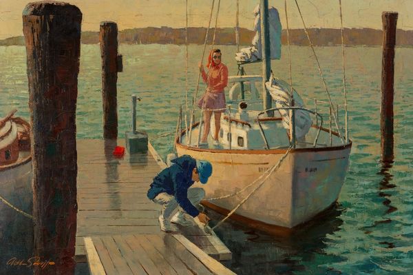 Arthur Sarnoff created this piece, Moonlight Sail, using oil paint. The painting immediately strikes us with its dramatic composition, dominated by cool blues and whites that evoke the stillness of a moonlit night. The sailboat cuts diagonally across the canvas, its sails billowing, creating a dynamic sense of movement. Sarnoff’s loose brushwork is particularly significant here. The texture of the paint mimics the choppy surface of the water and the soft glow of the moon filtering through the clouds. This technique, while representational, nudges the painting towards an exploration of materiality, where the medium itself becomes a focal point. The interplay of light and shadow is not merely decorative; it structures the entire scene, guiding our eyes and shaping our emotional response. Ultimately, Sarnoff’s Moonlight Sail is a testament to the power of formal elements to create mood and meaning. It reminds us that art is not just about representation but about the expressive possibilities inherent in the medium itself.