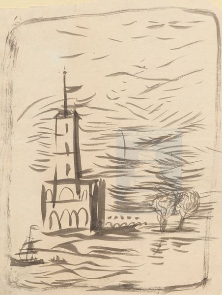 Curator: Jacob Kainen created this work, titled "Residential Facade," in 1949. It's an etching in ink, giving it a striking graphic quality. Editor: It does feel almost like an architectural blueprint, albeit one infused with a rather whimsical, slightly menacing energy. It makes me think of a haunted Victorian dollhouse. Curator: I find the blend of the representational and the almost abstract architectural details particularly interesting. Kainen evokes familiar imagery, but then fractures and rebuilds it. Think about the steeple on the building, practically screaming with authority against the swirling ether of the sky above, contrasted with the rigid symmetry and clean lines that frame it. What comes to mind? Editor: Right away, the "Residential Facade" speaks to a real engagement with the craft of printmaking. Etching relies on acid's effects on the metal plate; the contrast between precise lines and areas of rougher, more unpredictable texture makes it captivating. You can sense the labor involved, not just artistically but materially. Curator: I'm fascinated by the windows and how they each present different interior states. Some are vacant and hollow, while one peeks open slightly revealing a mysterious face staring out. Editor: That reminds me of how economic factors would absolutely determine the use of space at this time. Are these residences overcrowded? What does "facade" even mean in terms of what's happening inside, beyond what's presented to the world. The drawing gestures toward the realities of post-war urban life, but obscures them just enough. Curator: I see how those issues speak through, almost inadvertently adding layers of socio-economic consideration that enrich what, at first, could seem a simple architectural rendition. Kainen may have aimed at something straightforward, but that the times come charging forward in how we, in hindsight, see the drawing itself is one thing that stands out. Editor: Yes, seeing this, the process of production, the era of material scarcity and social constraint all linger as strong points. There's nothing naive about how buildings communicate culture.