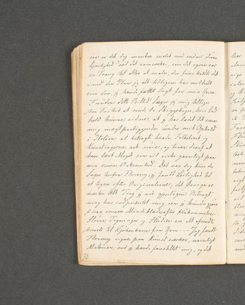 Curator: We’re looking at "Rejsedagbog. Brügge," a travel journal entry by Johan Thomas Lundbye from 1846, housed at the SMK. It's a miniature drawing on paper. My initial reaction is one of intrigue; the text seems to fill the page, leaving little room to 'breathe.' Editor: It does feel dense, doesn't it? Lundbye was heavily influenced by Romanticism and, seeing this, it's tempting to view this journal entry as a kind of relic representative of its time. Think about what travel meant in 1846—a more involved, romantic, reflective practice perhaps. Curator: I can see that. The meticulous script and lack of illustration speak volumes about the purpose of a travel journal during that period. It seems focused on capturing immediate, unfiltered impressions. It serves as documentary evidence of his emotional response to art of the past when it had only recently come to be seen that way. Editor: Absolutely. There's an interesting tension here between the personal, subjective experience and the societal norms influencing how travel—and its documentation—were perceived. This form of Romantic-era travel combined reflection with rigorous and learned appreciation. Curator: Consider also the implied audience, or lack thereof. Was this meant to be shared? Is that shaping the visual style? There’s so little visual information—so what does this imply about what Lundbye saw to be truly important to document? Editor: Right. Is the choice of script related to a desired image or identity? By emphasizing handwritten text and omitting any drawn imagery, Lundbye elevates words as the primary—if not sole—medium of representation in his journal entry. Perhaps, for him, writing facilitated a direct conduit for channeling sensory observations—visual ones included. Curator: Yes! And if we were to expand upon that, it is interesting how what we interpret the intention and potential outcomes of his choices given art and society at the time this was composed. I suppose his aim may not be as direct and true of documentation, or could it? What do you make of that in terms of the intrinsic design elements themselves? Editor: It is as if these marks attempt to give structure and form to time as its being experientially witnessed in place—not as simply objective information to recall later but a sensory event made more real. Perhaps, by visually translating sensation to mark, to inscription, the journal entry strives to act as a record and real artifact all at once? It’s fascinating. Curator: A fruitful way to consider how such a personal document is inextricably linked to cultural values of the time. Editor: Agreed. It’s a wonderful example of how form and content mutually inform each other within art's cultural fabric.