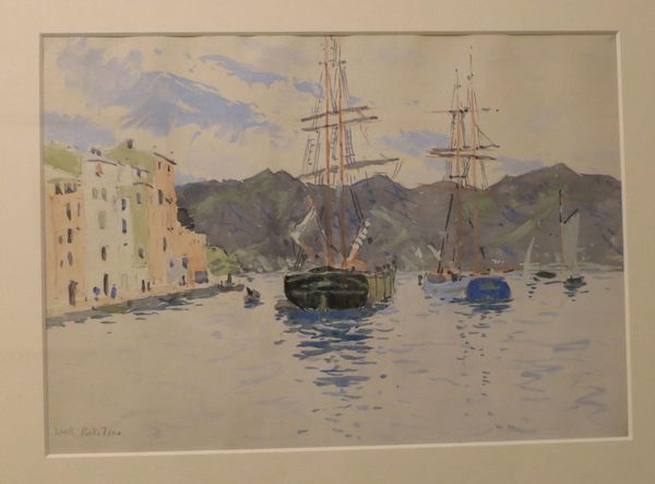 Curator: Here we have Denman Waldo Ross's watercolor, "Portofino, Italy," housed at the Harvard Art Museums. Editor: It feels like a hazy dream. The blues and whites are so soft, almost blurring the lines between water, sky, and distant mountains. Curator: Ross was deeply invested in the materials themselves. He explored color theory extensively and even developed his own system for organizing pigments. You see that evidenced in the limited yet harmonious palette. Editor: The masts of the ship are so central, aren't they? Dominating the composition. They almost read as religious symbols, reaching towards the heavens. Perhaps signifying exploration, aspiration... Curator: And think about the social context: travel, leisure, the rise of watercolor as a medium for the upper classes to document their journeys. It's not just pretty; it's indicative of a specific cultural moment. Editor: I find myself pondering what Portofino represented in the cultural imagination then, and perhaps still does now. A place of beauty, escape... Curator: True. For me, it is the application that reveals the artist's mastery. The materiality, not just the symbol. Editor: It's both, isn't it? They feed each other.