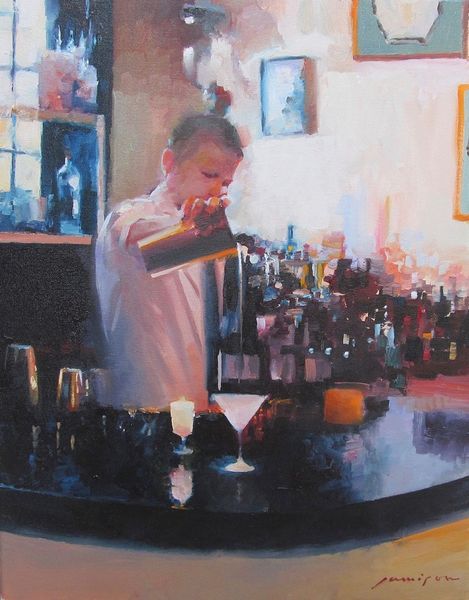 Editor: This oil painting, titled "What Will It Be" by Jeff Jamison, captures a bartender in a warmly lit setting. I find the scene very inviting, almost cinematic. How do you interpret this work? Curator: It's interesting to consider how this painterly style, with its roots in expressionism and figurative work, interacts with the setting. We have a contemporary artist engaging with genre painting, portraying a figure that is both ordinary and monumentalized, set inside a very coded and socially active site, namely the bar. Editor: Coded how? Curator: The bar isn’t just a place to grab a drink. It has a history – think about how bars and taverns have historically served as hubs for political discourse, social exchange, even artistic inspiration. How might this context change how we perceive this image? Editor: So, by setting the portrait in a bar, Jamison's placing this figure within a long, complex narrative about social spaces and their role in public life? That’s fascinating! The light and painterly quality create such a comfortable feel, but with that additional context, it does encourage deeper thought. Curator: Exactly. It challenges the perception of portraiture itself. The seemingly mundane scene reflects ongoing historical narratives and prompts conversations about the portrayal of working-class individuals in art, how the space is used and consumed, and the politics behind the act of painting itself. Editor: I hadn’t considered that this could challenge traditional portraiture. Thanks; this insight helps me understand how this painterly image connects to a wider social and historical perspective!