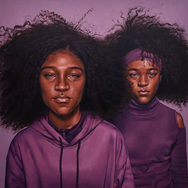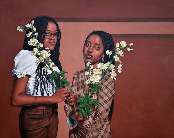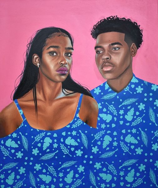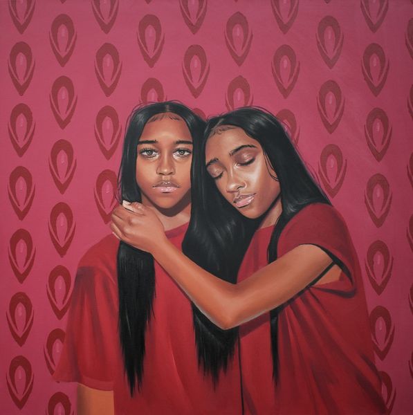 Monica Ikegwu's painting, "Fraternal," presents us with an exploration of kinship, rendered with oil. The muted tones and layered glazes create a surface that feels both smooth and deeply complex. Notice the way the light catches on their faces, particularly on the bridge of the boy's nose, there's a kind of gravity to the brushwork. The patterned background and the way it flattens the image, pushing the figures forward. The gesture of the girl's hand resting on her brother's shoulder is so tender, yet the formality of the portrait introduces a certain ambiguity. It reminds me of the work of Lynette Yiadom-Boakye, particularly the way she uses imagined portraits to explore ideas of identity and representation. Ultimately, Ikegwu's painting embraces this ambiguity, offering a space for contemplation on the bonds of family and the complexities of representation.