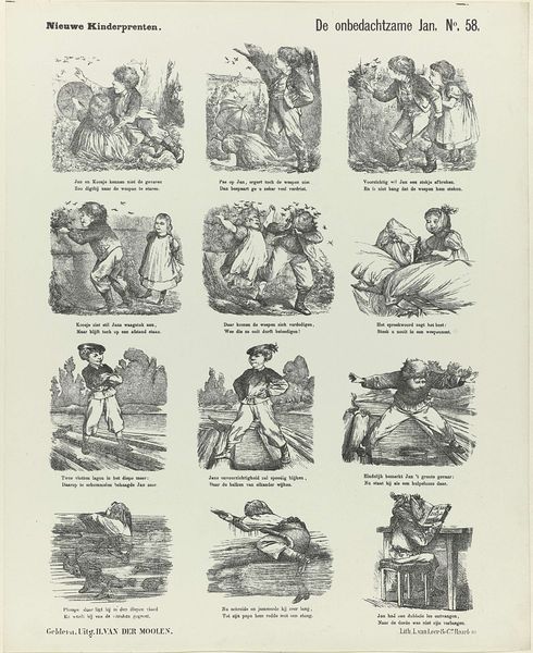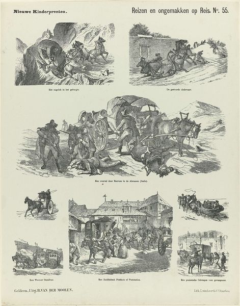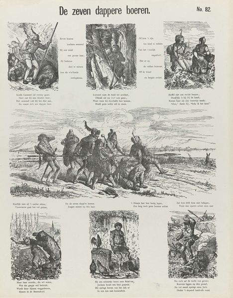 Curator: We're looking at "Een droom," which translates to "A Dream," an 1881 engraving by De Ruyter & Meijer. Editor: It's immediately striking. The overall impression is fragmented, like stills from an animated film. Curator: Absolutely. De Ruyter & Meijer have crafted a series of narrative panels on a single sheet, emulating sketchbook art. It combines imagery suggestive of the indigenous Americas. Note the variety in rendering and textural play—observe the lines making up different sections. Editor: There is something about the mark making. These marks and lines are not just descriptive, they also are building mood. In some areas of the sheet there is frenetic mark making suggesting conflict. This technique also contributes to a raw, sketch-like energy which underscores this work’s place within visual culture as opposed to high culture Curator: Precisely! They were engaging with prevailing depictions of indigenous cultures. Note how labor is involved in mass production versus that involved in singular drawings. How do these different means influence or relate to the depiction and reception of art Editor: Thinking about the engraving process itself, and its historical context in relation to visual materials—you know, these distributed prints really fueled how society understood people and their conditions. I imagine a world of imagery constantly reinforcing some of those ingrained preconceptions about different groups. Curator: A print like this enters into a cycle of production and consumption shaping perceptions while relying upon its audience and producers Editor: It really prompts you to consider what a 'dream' signified, not just for the figures depicted, but what these publishers imagined audiences found so captivating. I now think differently about the relationship between maker and object with that social cycle you've described in mind.