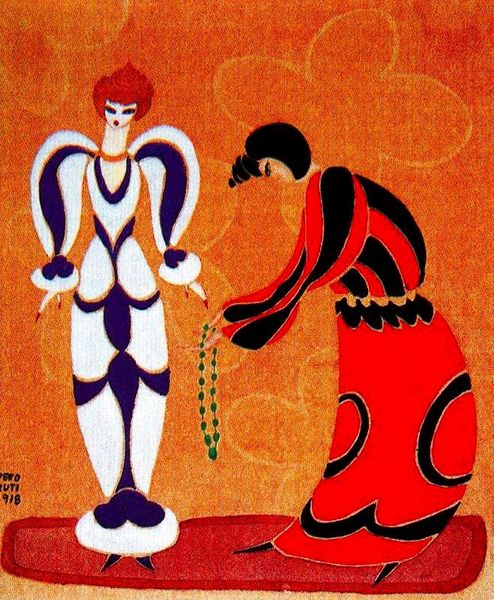 Curator: Here we have Pablo Picasso's costume design for the ballet "Tricorne," created in 1917, employing ink and watercolor on paper. What strikes you initially about this piece? Editor: My immediate impression is one of suppressed power. The figure, seemingly weighed down yet stepping forward, has a bizarre almost comic dynamism. The incomplete lines add to the sense of potential energy waiting to be unleashed. Curator: Precisely. This work serves as a critical example of the dynamism characterizing Picasso’s designs and the ballets he involved himself with. Given its creation amidst the backdrop of the First World War, one can’t help but consider it through a lens of broader social and political unrest, almost like a physical manifestation of the period's anxieties. Editor: I see how this burly man relates to anxieties: he recalls Atlas, forever bearing the world. I keep coming back to those blue accents. They’re unexpected, placed on the shins like that. What do you think they signify in the context of the entire design? Curator: That's a potent connection. The blue is fascinating and does not seem representational: perhaps a commentary on the artificiality of spectacle amidst the grittiness of lived realities. Picasso and his peers, after all, actively confronted class and nationalism through subversive caricatures in art and theater. Editor: The flame-like motifs also seem central to that symbolic role, repeating the same shade of red as that accenting his arms and torso, don't you agree? This hints at both dynamism and violence and draws visual references from classical figures in a playful modern form. Curator: Absolutely. His figures, like those encountered in revolutionary performances of the time, blur the lines between seriousness and farce. So to interpret them through modern themes, while always relevant, could undermine how it's meant to question the traditional hierarchies. Editor: Very true, a complex interplay to unpack, and essential for audiences to recognize. Curator: Indeed. This piece remains such an eloquent case of an artwork operating within broader themes, still speaking loudly through our modern perspectives.