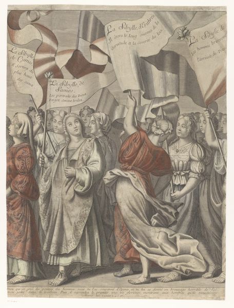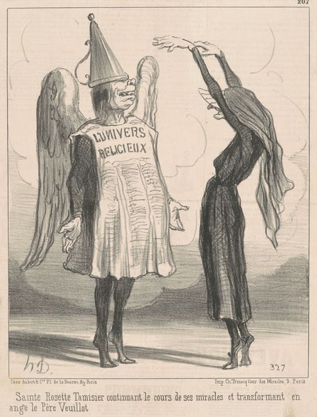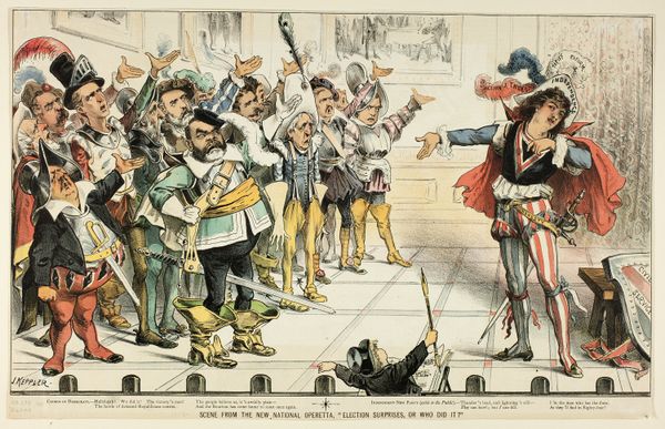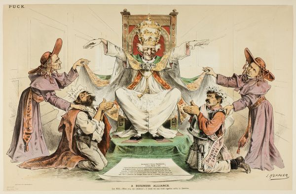 Curator: Here we have a print from 1896 titled "The Great Unknown," originating from Puck magazine and created by Louis Dalrymple, a master of caricature. What’s your initial take? Editor: It’s visually arresting, with a sort of ominous levity. The veiled figure dominating the composition seems to be the focal point of attention, and it immediately conveys an air of mystery… perhaps of deceit, with a certain puppetry at play given those reverent onlookers. Curator: I see it similarly. This print is a mixed-media work featuring watercolor and colored pencil, elements adding depth to its satirical punch. The veiled figure certainly grabs your attention – labelled ‘The Veiled Mahatma of Prosperity.’ Consider the symbolism of the veil: hidden power, obscured truths, or perhaps even manufactured mystique, prevalent within ideologies of success. Editor: Indeed. The work immediately reminded me of how social and economic forces were shifting dramatically in America at that time. What sort of narratives do we construct to explain that upheaval, and which ones serve our interests? Those prostrating themselves appear entirely willing to believe in whatever grand figure tells them, promising easy wealth without question, an incisive critique, considering the historical context. Curator: Precisely! The two figures acting as priests to this 'Mahatma' sport question marks on their robes, signifying perhaps the dubious nature of their claims, the propaganda of profit. This element resonates deeply. Culturally, magic was morphing into marketing. Promises were becoming more cryptic yet alluring, manipulating belief through spectacle. Editor: It makes you consider the role publications like Puck played in shaping public opinion and perhaps even how we frame “truth” now through caricature and symbolism. It suggests our eagerness to latch onto narratives of quick riches, which has always had resonance, a relevant social commentary, even today. Curator: Absolutely, which brings a final perspective: beyond its obvious critique of capitalist excesses and unquestioning faith, the print makes us reflect upon what "prosperity" means, the real cost of wealth, and the danger of obscuring core values under the guise of profit, revealing layers of meaning. Editor: Ultimately, its critique pushes us to consider the enduring power of images to not only reflect society, but shape our social consciousness, a challenging thought when considering "The Great Unknown."