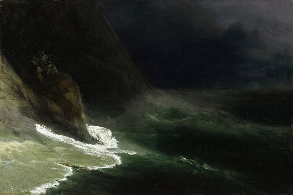 Editor: So, this is Peder Balke’s "Rough Sea with a Steamer near the Coast of Norway," painted sometime between 1847 and 1850. The overwhelming feeling is drama. I’m struck by how Balke uses such dark oil paints to depict this powerful scene, even the sky. What do you see in the materials that Balke employed? Curator: Well, the use of oil on canvas here isn’t just about rendering a scene. The materiality speaks volumes about accessibility and the developing art market. Oil paints, by this period, are becoming increasingly standardized and available. Balke wasn't grinding his own pigments like earlier masters, which frees up time to explore abstraction within landscape painting. The relative ease of production using modern materials is something that makes this painting special, as opposed to prior uses for exclusively monumental, state-sponsored purposes. Editor: That’s fascinating! I hadn’t considered the impact of standardized materials. Did this affect the size or scale of artwork that became popular? Curator: Absolutely! Look at the scale here. This canvas isn’t monumental like a history painting designed for a palace. Its accessibility extends beyond the mere availability of paints; it reflects a changing audience and a new market where smaller, more intimate works could find buyers amongst the rising middle class. Consider the production and consumption intertwined – smaller, affordable materials facilitated a greater volume of artwork available to a much wider social circle. Editor: So, it's not just about the visual drama, but also the quiet revolution in art production and who could access art? Curator: Precisely. Balke isn't just showing us a rough sea, he’s also indirectly showing us the rough and tumble of the changing art world. A changing mode of painting created a material and intellectual change to how art was made. It helps to remember that there would have been a whole team involved with getting the paint from a pigment to a useable form for Balke. Editor: That perspective really transforms how I see this piece! Curator: It also highlights the inherent human labor involved in production. From a single artist to the team, Balke reminds of about the hidden costs involved.