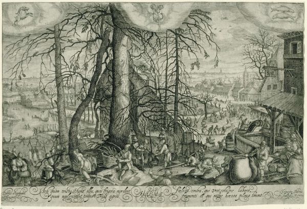 Editor: So here we have Pieter Bruegel the Elder's "The Gloomy Day," painted in 1565, using oil on panel. It feels, well, rather bleak, doesn't it? You can almost feel the damp cold. What can you tell me about this piece? Curator: Notice how Bruegel represents the peasants' lives? He gives prominence to their labor. The people aren't idealized, it's an honest portrayal of their daily grind. He represents their labor as inherently linked to the environment’s own cycles, but where is the dignity in such material hardships? What does the portrayal of work communicate about the social status of the peasant class, and the consumption of their labor by a wealthy patron? Editor: So you're saying it's less about the gloomy weather and more about the gloominess of the peasants' lives? Curator: Precisely! He represents a particular material reality. Bruegel doesn’t just depict peasants; he places their activities – chopping wood, tending animals, and simply existing in this harsh environment – at the heart of the work. Do you see that? It makes me question who exactly will view, own, and derive value from a work like this that celebrates what others may disparage. It makes you reconsider traditional hierarchies between high art and everyday life, doesn't it? Editor: It certainly does. So it's less about the aesthetic beauty, and more about making you think about class, labor and economics? Curator: Indeed! That the painting, the physical object itself, is born of this same world of commerce and labor. Consider how it will circulate and be valued. Editor: I never would have thought of it that way! I see the painting, and Bruegel's overall project, in a completely new light. Thank you. Curator: You're very welcome! There's a lot to unpack when we examine art through the lens of material and social production.