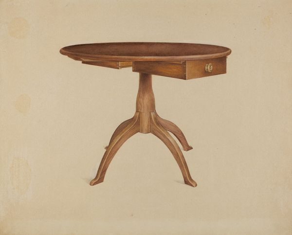 Florence Choate made this "Pembroke Table" drawing with what looks like watercolour or gouache, the kind of materials that let you build up smooth, even tones. The colour palette in this piece is really restrained, mostly warm browns and tans. It’s like she’s trying to capture not just the look of the table, but also its very essence, its history, you know? The way the light catches the edges of the wood, the subtle gradations in the surface of the tabletop. Look closely, and you'll see the individual brushstrokes, the way she’s layered the paint to create depth and dimension. It’s not about flashy technique or bravura brushwork. It’s about careful observation, quiet dedication, and a deep respect for the material world. It reminds me a bit of Agnes Martin's drawings, in their quietness and simplicity, yet they manage to convey so much. It’s like a little poem, full of understated beauty and quiet contemplation.