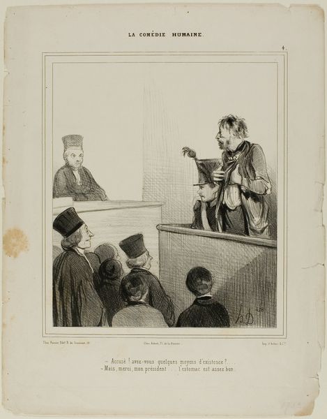 Editor: This is "Excuse me! Do You Have Any Manners . . ." by Honoré Daumier. I believe it's a lithograph, and it depicts a courtroom scene. It looks like an indictment of social norms. What can you tell me about the materials and the making of this piece? Curator: Daumier's choice of lithography, a relatively new and accessible printmaking technique, is crucial. It allowed for mass production and distribution of his satirical commentary. Consider the societal implications of making art available to a wider audience – how does that affect the power dynamics of art itself? Editor: So, the medium itself is part of the message? Curator: Exactly! Daumier uses a commercial medium to critique the very structures of commerce and power he participates in. He is examining labor, materiality, and consumption through his work. Editor: That's a powerful thought – using the tools of the system to critique the system. I hadn't considered that. Curator: By considering the materials and production, we reveal a deeper meaning beyond the immediate image.