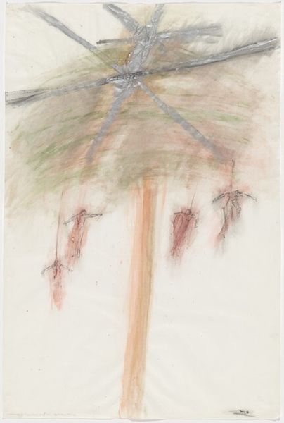 Curator: Jimmy Ernst's "Study for 'Icarus', No. 1," from 1964, is before us, rendered in watercolor and colored pencil. Editor: Well, my immediate reaction is that of an impending storm. The contrast between the agitated dark mass above and the relatively calm blue field below creates a palpable tension. Curator: Indeed, Ernst employs abstraction here to convey a sense of atmospheric unease, drawing the viewer in with expressive marks. His engagement with these mediums shows he knew the cost and scarcity, and worked on paper in advance of his later paintings. One has to assume he planned the labor appropriately. Editor: The way he layers the watercolor washes to build depth is masterful. Notice how the linear quality of the colored pencil creates movement, almost like a flock of birds taking flight... or perhaps a fall from great height? The contrast between the black harsh, feathered pencilstrokes against the softness of the blue could very well express Icarus’ final moments. Curator: The title is so interesting as the name of his work relates to ideas of hubris and the danger of unchecked ambition. Given its historical context of Cold War tensions and anxieties, how do you read into that with Jimmy Ernst's own background being someone whose family fled the Nazis? It reflects something about post-war labor that goes unseen, even though we all know of the Marshall plan... Editor: Perhaps. Although, on the other hand, there is an undeniable sense of vulnerability captured within his composition. The tension in the brushwork might also embody resilience or the persistent striving despite adversity. The composition might not just about the horror of falling but the ambition to rise and the cost that follows... Curator: Thank you. It's a perfect insight, that is something to be left lingering in our audience's ears. Editor: Glad to share this reflection; there is always an alternative angle from looking at art that changes in the course of its context.