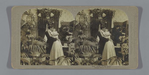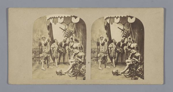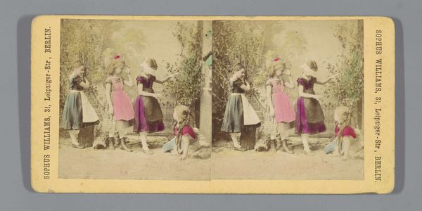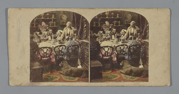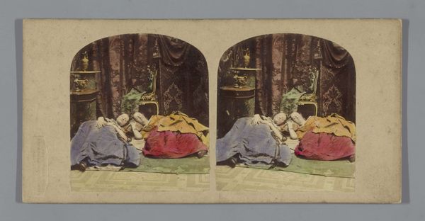 Editor: Here we have John Reynolds' photographic print "Scene with Nel and her grandfather from The Old Curiosity Shop" dating from 1857-1859, done as a collotype, hand-colored with watercolor. I notice how cluttered and theatrical the setting seems, almost staged for a moral lesson. How do you interpret this tableau, especially given the rise of photography at that time? Curator: It’s important to remember the social context here. Dickens’ novels, like "The Old Curiosity Shop," gripped Victorian England with tales of social inequalities. Photography at this time was being debated, about its ability to reproduce truthful representations, or aesthetic interpretations of those realities. Editor: So, you're saying Reynolds' image taps into both literary popularity and this debate about the realism of photography? Curator: Precisely. This image is part of pictorialism movement of that time. This image is attempting to achieve status, and influence social issues through posed arrangements, narrative elements and watercoloring, blurring the line between photography and painting to imbue the image with the gravitas of ‘high art’. Editor: It's interesting how he used new media and fiction to tackle societal issues, using new representational power while alluding to more classical ways of art-making. Curator: And think about the function of museums and galleries at that time, vying to solidify cultural norms. Reproducing sentimental scenes like this visually reinforced contemporary ideas of childhood innocence, family responsibility and social welfare, making them widespread through accessible and easily circulated media. The viewer has a moral role to play within this photograph. Editor: This makes me appreciate how deliberate the choices were—staging, composition, and all. Thank you. Curator: And it helps us recognize how much these ‘artistic’ photographs were also social tools, subtly shaping public perception.