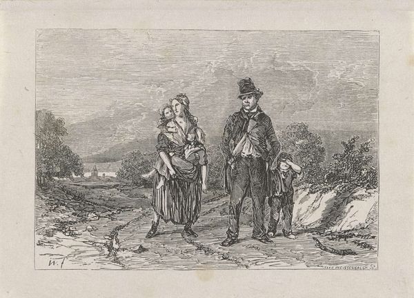 Curator: Today, we're examining a lithograph from around the 19th century by Honoré Daumier, titled "En v'la un qu'est un drôle de corps . . ." The piece presents a caricature of a landscape painter, as observed by two figures in the foreground. What are your initial thoughts? Editor: It strikes me immediately as a work deeply embedded in social observation. The rough lines and the seemingly quickly rendered details feel very connected to a specific moment and the everyday materials of printmaking available at that time. Curator: Absolutely. The composition itself is rather ingenious. The artist has clearly captured an attitude, a specific socio-economic class scrutinizing the bourgeois landscape painter. Daumier masterfully employs contrasting lines—the crude rendering of the two figures set against the more delicate strokes suggesting the landscape painter at work. The landscape is just the material representation. Editor: The medium, lithography, also informs the message. This isn't some grand oil painting meant for a salon. It's a print, intended for wider distribution, engaging with contemporary discussions and likely sparking dialogue among the working class who would recognize the class commentary. The accessibility of the printed image invites more eyes, not fewer. Curator: Precisely! Daumier used the means of production to comment on it. He also cleverly uses a subtle satire by mocking a profession—landscape painting— which then was considered one of the fine arts. The caricature-esque figures provide visual relief while the inscription adds another dimension of interpretive engagement for those that are not represented. Editor: This work really foregrounds the idea that the value of art lies in its use. In its original moment it probably incited discussion about what kind of labour counts, whose activities are memorialized as 'art,' and what is simply manual labour. Curator: Looking at the larger meaning that is encoded in Daumier’s work, it offers a fascinating reflection of the evolving status of art. Editor: Yes, by understanding the conditions and mode of production of the artwork itself, the critique is even sharper. It asks the viewer to think not just about what is represented, but also who has the privilege to represent it. Curator: This piece provides insight into art’s intricate connection to labour. Thank you for helping bring light to some other angles of thinking around the visual.