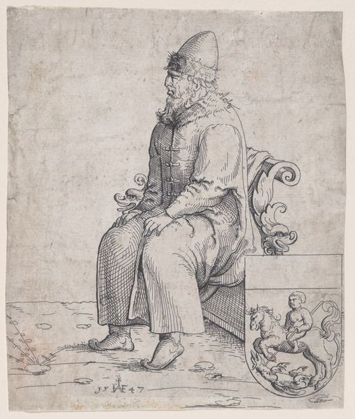 Curator: We're now standing before an engraving from between 1610 and 1618. It's a portrait of Cornelis Engebrechtsz at 60 years old by Hendrick Hondius I. Editor: My first impression is of controlled elegance, a sense of dignified reserve. The line work, even from a distance, seems incredibly precise. It's a striking image. Curator: It’s definitely a well-executed example of Baroque portraiture, emphasizing line work. Considering the printmaking context of the era, these kinds of portraits played a key role in circulating the images and likenesses of important figures. They contributed to creating their public image and legacy. Editor: Exactly. Look at how his attire and the scroll in his hand signify status and knowledge, what with his palette and brushes mounted on the wall. It’s not merely a representation; it's a careful construction of identity, almost an exercise in image politics. The slight contrapposto pose further lends this sitter both an aristocratic and intellectual demeanor. Curator: Note the placement of the palette on the brickwork: Hondius plays with textures in ways that complement Cornelis' presentation of himself, pictorially linking him to architecture and permanence. Editor: Precisely, and in line engraving, that texture is paramount! The composition, the lines – they all converge to underscore the sitter's significance. And, looking closer, the formal arrangement echoes through artifice rather than being realistic per se. Curator: It reveals the power of printed imagery in shaping historical perceptions and solidifying the artist's place within it. Editor: I concur, and in this case, Cornelis Engebrechtsz becomes not just a man, but an idea propagated by form and line, skillfully crafted and intentionally circulated by Hendrick Hondius I, making their alliance ever present even now, centuries later. Curator: A valuable contribution to understanding the complexities of historical representation! Editor: Absolutely, another opportunity to examine and assess the power of art to define the times it portrays.