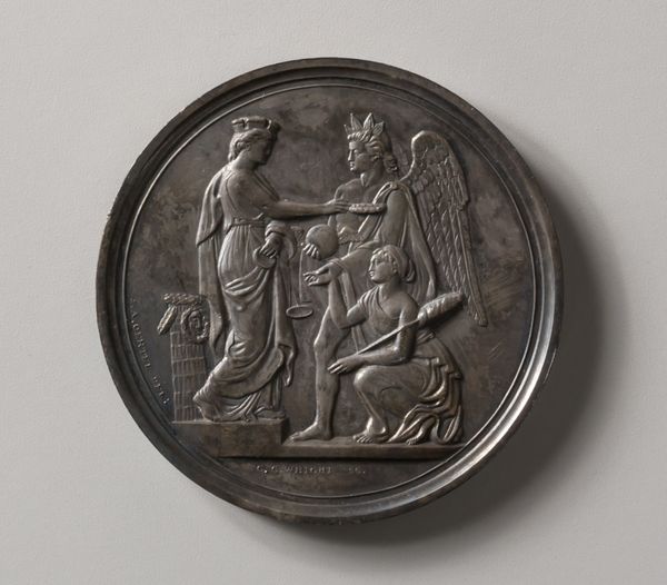 Editor: Here we have a bronze relief, a medal actually, entitled *Saint Luke Painting the Virgin*, crafted by Ermenegildo Hamerani in 1704. There's something quite charming about its size and detail. I'm curious, what strikes you most when you look at this? Curator: Well, darling, immediately, I'm tickled by the meta-ness of it all! Saint Luke, the patron saint of artists, immortalized in bronze, creating an image of the Virgin Mary. It's art reflecting art reflecting faith. Do you get a sense of the implied importance conveyed in its circular format and depth? Like, is this small portal into a significant historical and artistic concept hinting that something BIG is going on? Editor: I do! It feels like looking through a keyhole into a pivotal moment. It’s interesting how he is placed to the earthly level while his subject matter lives in the clouds... Was there a broader interest in the life of Saint Luke around this time? Curator: Oh, undoubtedly! In the Baroque era, there was a hunger to connect faith to tangible things. Visuals and the process of their creation, had immense religious and political sway. Luke, who was not just a saint but also an artist, perfectly embodied this divine-human link. Can you see how this is cleverly communicated via visual compositional balance and detail? Editor: Absolutely. There's this blend of earthly craft and divine inspiration. That’s making me rethink my initial view on religious art from this period. Curator: Isn't it marvelous how art can change our perspective, my dear? Even a small bronze medal can contain worlds within its tiny, carefully wrought dimensions!