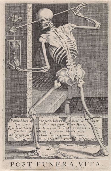 Curator: Pieter van Gunst's "Anatomical Model of a Human Skeleton," created around 1685, presents a rather striking image. Editor: My immediate reaction is one of somber elegance. The precision of the engraving combined with the classical setting gives the skeletal figure a sense of contemplative grace, despite the morbid subject matter. Curator: Indeed. The piece exemplifies the academic art tradition through the skillful rendering of anatomical detail. The formal elements – line, tone, and composition – converge to create a powerful memento mori. Note the precise articulation of each bone. Editor: But let's consider the means of its production. The print, an engraving, suggests a wide distribution. It raises questions about access to medical knowledge in the late 17th century, and for whom were such detailed images created? How did this engraving circulate through society, shaping understanding—and perhaps anxieties—surrounding the body and mortality? Was it meant for instruction or purely contemplation? Curator: A crucial question. The image works on multiple levels. It appeals to both scientific and artistic sensibilities. The use of chiaroscuro creates depth, highlighting the interplay of light and shadow across the bones and drapery. We see this used with the column capital beside the skeleton to create a strong illusion. It invites the viewer to appreciate the underlying structure and geometry inherent in human form. Editor: It speaks volumes about the societal gaze on mortality. This piece likely reveals more about attitudes toward the body and scientific exploration. The level of craft involved elevates this scientific illustration beyond mere representation. There's clearly artistry at play, manipulating the medium of engraving for expressive impact, not just factual documentation. Curator: I agree entirely. This isn't simply a dry anatomical study. Van Gunst masterfully elevates the genre through formal innovation. He integrates visual, intellectual and spiritual elements. Editor: Seeing how process shapes both production and reception shifts this image beyond a simple document, inviting us to reflect on its journey from creation to our present viewing. Curator: It underscores how even the most functional image can transcend its original intent through skillful artistry. Editor: Yes, a fine display of embodied understanding turned to tangible rendering and the social implications thereafter.