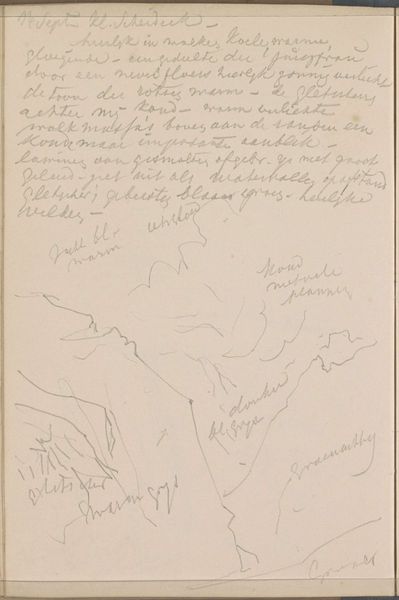 Curator: This small drawing, rendered in pencil, is titled "Gezicht in de duinen, met kleurnotities" or "View in the Dunes, with Color Notes." It comes to us from Gerrit Willem Dijsselhof and we believe it was composed sometime between 1876 and 1924. Editor: It looks like a hasty notation. Quite loose, gestural even. The scribbled words floating above the landscape suggest color or light variations. Curator: Exactly. Dijsselhof's landscapes exist at an intersection of impressionistic sensibilities with a Dutch artistic heritage steeped in naturalism and a growing cultural embrace of symbolism. This study reveals Dijsselhof’s artistic process, his engagement with color theory, light and atmosphere—key elements for artists interested in modern approaches. Editor: Look at the varying pressure of the pencil, though. In some areas it is soft and diffused, in others quite sharp and defined. The line quality, especially considering the landscape, imparts a sense of the wind shifting across the dunes, which are really the central focus. The words, for me, disrupt that sense of quiet observation of nature. Curator: True, but they ground the image in reality. Landscapes such as these provided accessible sites for artistic study while fulfilling an important social need: promoting and celebrating unique qualities of the Dutch countryside to an urbanizing populace. Such landscapes became tied to Dutch national identity. Editor: So the act of sketching "en plein air," regardless of the immediacy we see in it, had broader implications. Curator: Certainly, this piece comes to us from the height of the Dutch landscape tradition that was heavily supported through institutional patronage and cultural appreciation, which served the larger cause of cultivating national sentiment through imagery of its beautiful terrain. Editor: It’s easy to overlook the political considerations that influenced Dijsselhof and other landscape artists from the time. Viewing the piece with your remarks about patronage gives me more to think about than just the tonal variations! Curator: Yes, it highlights how seemingly simple landscape drawings can reveal layers of historical and social meaning.