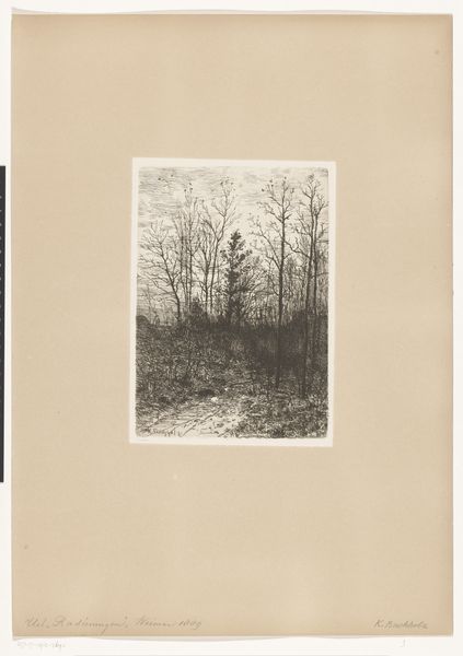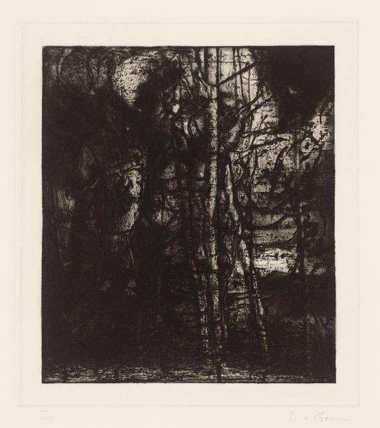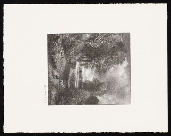 Editor: Here we have Alfred Alexandre Delauney’s "Waterfall in a Forest," created sometime in the 19th century. The density of the trees makes the work feel very enclosed. What's your take on it? Curator: This piece speaks volumes about the romanticized view of nature dominant during that era. The forest, often depicted as sublime and untouched, masks the reality of resource extraction and colonial exploitation of land. Do you see how the light, almost like a stage spotlight, emphasizes the "naturalness" while obscuring the labor involved in shaping such landscapes? Editor: That's a perspective I hadn't considered. I was focused on the aesthetic. Curator: Exactly. By deconstructing these images, we can challenge the romantic myths surrounding nature and understand how they intersect with power dynamics and environmental justice issues. Editor: I'll definitely look at landscapes differently from now on. Curator: The point is to look at the past, and landscapes, critically. Delauney's work acts as a mirror reflecting not just the beauty, but the complex socio-political currents of his time.