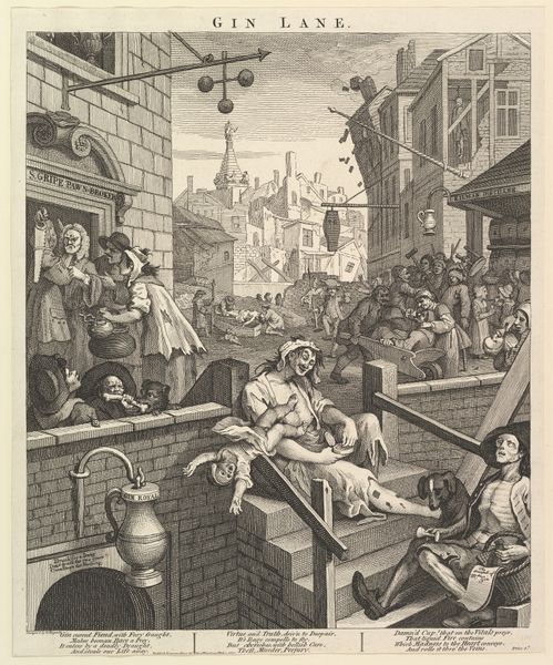 William Hogarth created "Gin Lane," an engraving, sometime around the 18th century. The composition is organized using strong diagonal lines, pulling the viewer's eye from the depth of the street to the foreground steps. The artist uses linear hatching to create texture, suggesting decay and chaos. The image creates a sense of societal breakdown. This piece is a critique, using the visual language of caricature to challenge the viewer’s complacency. The chaotic arrangement of the figures, their exaggerated expressions, and the crumbling architecture all destabilize any sense of order. Hogarth uses the structure of the image itself—its lines, shapes, and composition—to reinforce this message. Consider, for instance, the off-kilter perspective and the frenzied activity. These elements work together to undermine established visual and moral norms. Hogarth’s Gin Lane isn't just a depiction of social decay; it’s an active disruption of conventional artistic and societal values.