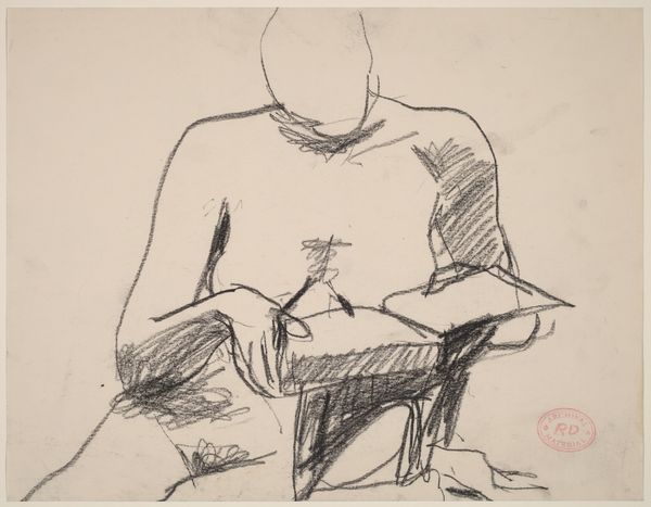 Curator: This ink and charcoal drawing, simply called "Untitled [seated figures]" is by Richard Diebenkorn, created sometime between 1955 and 1967. What leaps out at you? Editor: Well, immediately, it's this feeling of relaxed observation. The casual pose of the figures, the spare lines, it’s like catching a glimpse into someone’s afternoon. Almost voyeuristic, you know? Curator: Precisely! Diebenkorn really captures a sense of intimacy with such economy. It's more than just a portrait; it's an environment created with lines. The visible window pane behind them subtly emphasizes that feeling of ‘peeking in’ that you mentioned. Editor: It also makes me think about the role of art itself. Both figures appear to be engaged with something in their hands. One even has an object resting in his hands that is resting over his crotch, which is an erotic touch to the seemingly normal domestic setting. Is Diebenkorn suggesting art’s self-reflectivity? That’s very typical for how an artist views the world, but these days that just isn't possible given today’s society that over saturates its audience to consume everything all at once. Curator: The open composition leaves it unresolved; it suggests a momentary, fragmented narrative. There’s that still life at the bottom. Diebenkorn adds a second still life into a figural work; however, one is sketched atop a work while the other, the wine and the accoutrements, lives in our figural scene in three-dimensional existence. Editor: I feel the abstraction lends it such modernity! He uses very few, careful, distinct lines that suggest a deep complexity. No shading, no embellishment, but plenty of substance, in many regards. I admire this balance Diebenkorn offers the viewer: familiar yet distanced; concrete yet interpretive. Curator: Absolutely. The figures, almost dissolving into line and space, invite a more interpretive reading. We get to feel a presence, rather than just passively see one; but it also reflects a period of great transition in American art—between figurative and abstract approaches. Diebenkorn holds the two spheres beautifully and tentatively. Editor: So true. It is that quiet negotiation of space and form that makes this ‘Untitled’ piece resonate so strongly. Its simplicity conceals profound depths and it mirrors the cultural history from where it comes. Curator: Indeed. This peek into Diebenkorn's artistic negotiations shows us not just what he saw, but how he learned to make sense of it all.