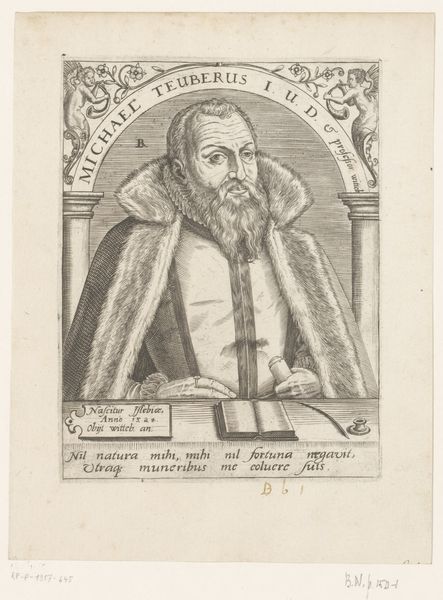 Curator: Here we have Thomas Hirschmann's "Portret van Georg Rupprecht," an engraving dating back to 1683. Editor: The intricacy of the lines is astounding. The portrait feels formal and a little austere. The textures, especially in the beard and the drapery, are incredibly detailed for an engraving. How would you interpret this work, focusing on its formal qualities? Curator: Let us analyze the composition. Note how Hirschmann utilizes line to create depth and shadow. Observe the contrasting densities of line – heavier to define the face and beard, lighter to suggest the folds of his clothing and the inscription around the portrait. This contrast creates visual interest. The oval border serves to contain the figure, creating a sense of defined space. Do you find that this containment draws the viewer’s eye towards Rupprecht's face, making him the central focus? Editor: Yes, the tight framing really forces you to engage with his gaze. The way the lines converge seems calculated to emphasize his presence. Is there any deeper meaning in how he positioned the text? Curator: Precisely! The carefully rendered lines, textures, and shapes combine to give us the essence of Rupprecht. Hirschmann's deliberate choices in rendering form through line and shadow, along with text, show the balance between figure and text in service of constructing an idealized representation of Rupprecht. Editor: I never thought about an engraving in terms of visual weight and balance, but the framing and details definitely support a visual hierarchy. Curator: Precisely. Approaching a work from this angle helps to unlock the language of form and appreciate the artistry behind even seemingly straightforward portraits.
