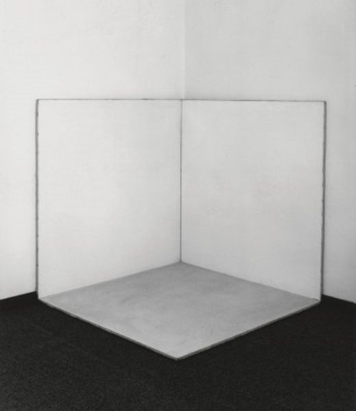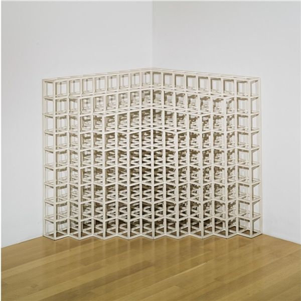 Curator: Welcome. Today we're considering Phillip King's sculpture, "Window Piece" from 1961. Editor: Well, right off the bat, I'm struck by its quietness. It’s this stark white geometric form, a sort of frame, that demands stillness and invites contemplation. Curator: Absolutely. King was very interested in the ideas circulating in the early 60s, notably modernism and minimalism, responding to anxieties regarding industrial advancements and the nuclear threat, creating works that were at once abstract and powerfully evocative. "Window Piece" serves as an excellent example of the public mood at this time. Editor: It is primarily a sculpture fashioned out of wood, I'd wager, and completely whitewashed. Looking closer, it appears to have a handcrafted texture, those little ridges, almost like repetitive chisel marks. They are not entirely even, hinting at the labour involved in creating such seemingly simple forms. It bridges the industrial aesthetic with handcrafted imperfections. Curator: I agree. Phillip King initially apprenticed as a metalworker before transitioning into art studies at Saint Martin's School of Art. It's a compelling example of how traditional sculptural materials can express these abstract ideals through socio-political conditions. Editor: Exactly. He used his training and labor experiences as a starting point to elevate standard or leftover wood scraps into refined and sophisticated artworks and I imagine he embraced these techniques quite intentionally. By doing this he also blurs lines between utility and fine art. Curator: This reflects his connection to wider conversations in post-war sculpture concerning the democratisation of art objects and public participation through sculpture. These sorts of dialogues also made work such as his more politically engaged with ideas of accessibility of art and artistic representation for public audiences. Editor: Indeed, it's this material engagement combined with conceptual underpinnings which I find really remarkable. King's emphasis on process and production truly resonates when observing how it stands as an austere geometric marker, prompting viewers to examine relationships within its own materiality. Curator: It all adds up to an incredibly insightful statement on sculpture in its own socio-historic moment. Editor: Ultimately, it seems King wasn't only interested in making objects, but facilitating interaction between material, meaning, and lived experiences through production, all framed inside an almost "window".