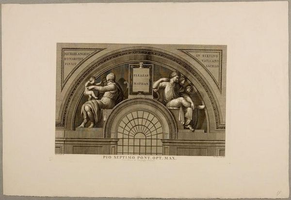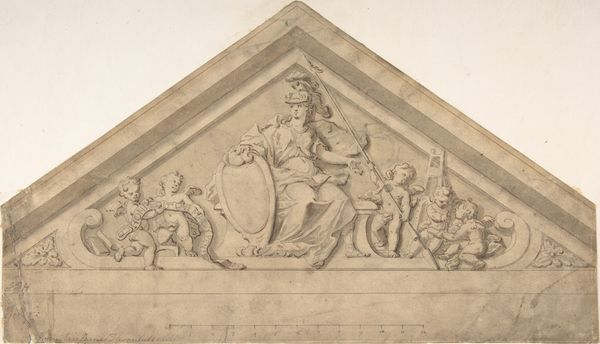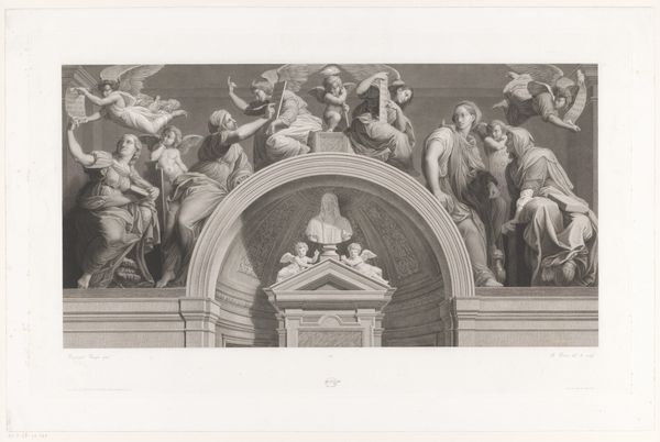 Curator: This is Claude Marie François Dien's rendering of "Sibyls," housed here at the Harvard Art Museums. Editor: Immediately, I see balance in the composition, mirroring figures on either side of the central archway. It evokes a serene, almost classical sensibility. Curator: Dien captures the Sibyls, prophetesses of antiquity, surrounded by cherubs, holding scrolls that speak of future knowledge and wisdom. The piece feels like a cultural echo. Editor: The monochromatic palette—achieved through subtle tonal shifts—adds to the sense of timelessness. The smooth lines enhance the sculptural, almost bas-relief quality. Curator: Notice how the figures are draped, revealing the classical ideals of the body but also concealing deeper, perhaps unknowable, truths about fate and destiny. Editor: The arch itself frames not only the bust but a void, suggesting perhaps that prophecy is not always clear, or easily interpreted. Curator: It reminds us that these figures, though rooted in mythology, continue to resonate in our collective imagination, influencing art and literature for centuries. Editor: Indeed, the interplay of light and shadow allows the eye to wander, piecing together meaning within a precisely organized tableau. A testament to form.