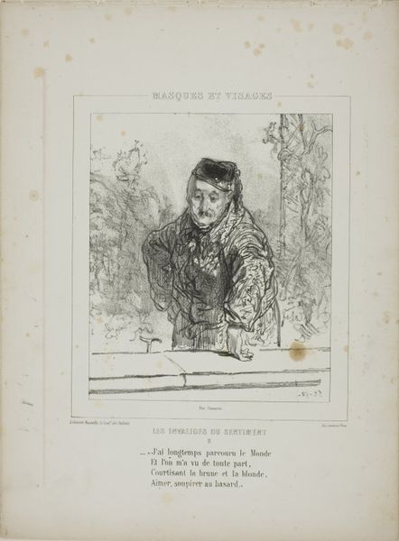 This print, "Les Invalides du Sentiment: A été "jeune premier," was created by Paul Gavarni sometime in the mid-19th century. Gavarni was a keen observer of Parisian life, and his work often satirized the changing social mores of his time. Here, we see a man, once a leading man, now past his prime. The title translates to "The Invalids of Sentiment," suggesting a critique of those who dwell on past glories. The man’s slumped posture and melancholic expression speak to a sense of loss and irrelevance, a sentiment that may have resonated with a society undergoing rapid transformation. Gavarni's work often touched on themes of aging, class, and the performance of identity. Through his art, he captured the anxieties and contradictions of a society grappling with modernity, inviting viewers to reflect on the transient nature of fame and the challenges of adapting to changing social roles.