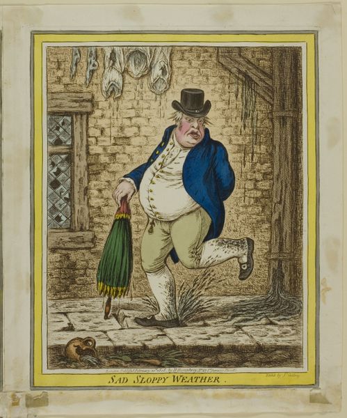 Editor: Here we have James Gillray’s 1809 etching "Pillars of the Constitution," now at the Met. What strikes me is how clearly it’s meant to be satirical, judging from the exaggerated features of these two gentlemen. How should we interpret its cultural context? Curator: Well, first consider what “constitution” meant at the time. Gillray created this print during a period of immense political and social upheaval. The constitution, far from being a sacrosanct document, was actively shaped by the elite classes, like these caricatured men exiting Brook's Club, a famous Whig establishment. Editor: So, it's a commentary on the Whigs? Curator: Exactly. This piece critiques the underpinnings of political power in Britain, namely the close ties between aristocratic identity and political decisions. Consider, for instance, the figures' unsteady gait, implying their intoxicated state outside of Brook’s club, with the detail of a wine bottle literally bulging from the pocket of one of the gentlemen. Editor: So, "Pillars of the Constitution" is sarcastic, meaning more like, ‘these are the pillars holding things up?’ Are there specific people represented here? Curator: It's generally accepted that these are caricatures of prominent Whig politicians, most likely Lord Grenville and the then-Foreign Secretary Lord Howick. These portrayals are designed to lampoon the supposed moral and intellectual decay within Britain’s governing class, making a broader claim on the elite class of this era. The imagery thus operates on two levels: recognizable public figures, and recognizable political critiques. Editor: It’s fascinating to see how the visual arts participated so directly in the political discourse of the time. Curator: Indeed, and it is important to remember how the elite class and specific sites of gathering shaped art, such as prints, that have been accessible to broad audiences throughout the historical record.