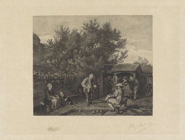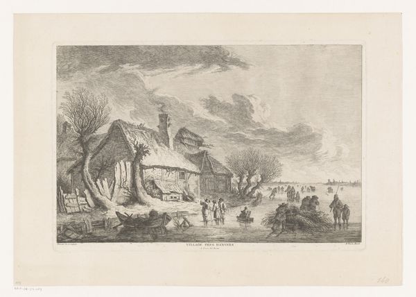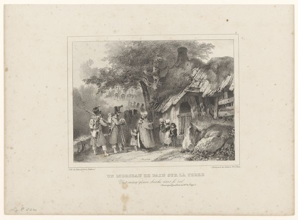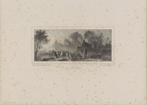 Curator: Here we have Nicolas Toussaint Charlet's "A Scuffle, 1832," rendered with lithograph, ink, and watercolors on paper, here at the Rijksmuseum. It's a fascinating look into urban unrest of the period. Editor: Whew, it feels like I walked right into the middle of it. Dense, crowded, and with this swirling sense of movement that’s kind of exhilarating and unsettling at the same time. The muted tones amplify this agitation, and even make the piece feel cold. Curator: Exactly. Charlet captured the spirit of social upheaval through the lens of genre painting. In the post-Napoleonic era, street scuffles were almost performances of public dissent. Watercolors add depth, don't they? Editor: They do. But look how deftly he handles light and shadow – it adds a dramatic intensity that belies its modest scale. And that windmill in the background! Juxtaposed against the chaotic throng, it suggests maybe something more significant than just an ordinary fight brewing beneath the surface, doesn’t it? Like societal pressure slowly pushing the common person toward resistance. Curator: Precisely! It subtly embeds a broader socio-political reading into an ostensibly simple street brawl. The placement of figures creates implied relationships within this scuffle that hint at class tension. Consider that backdrop; the architecture and figures create a sense of claustrophobia for those participants in the street who are further from its perceived comfort. Editor: Ah, you're good, like finding metaphors hidden in plain sight. To me, it just screams, “Watch out for pickpockets!” Though maybe the real theft here is the gradual erosion of societal harmony. Curator: An acute point. In observing such artworks we consider that beyond mere observation, art holds space to witness history through varied, even intimate perceptions. What someone considers mundane, such as neighborhood architecture, to me, it holds much about wealth disparity between then-citizens and that societal force they contended against. Editor: Absolutely, stepping back into the mindset of 1832 truly lets me sense not only what went on outside but within. Curator: Indeed. Charlet's ability to merge individual character study with broader societal critique provides a lens to reflect on public sentiments across time and place. Editor: Right! A deceptively detailed, evocative snapshot pulled from a moment brimming with tension. It speaks to a society far from settled, even amid pastoral surroundings.
