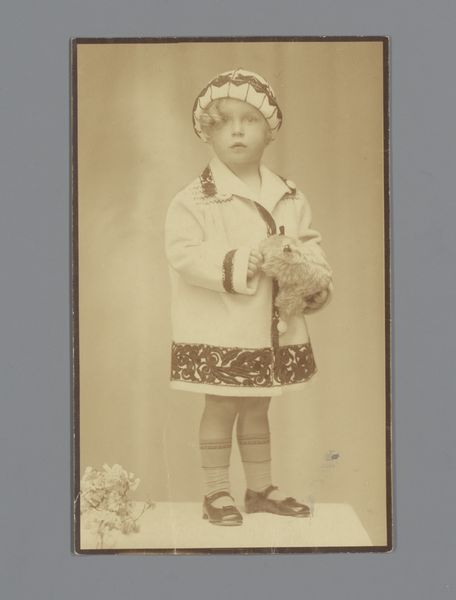 Curator: This small, undated photograph, "Untitled (portrait of a little girl)" by John Deusing, presents a child in an elaborate outfit. The image is a photographic negative, adding to its ethereal quality. Editor: My first impression is how haunting it feels, despite the girl's somewhat sweet attire. There's an unsettling pallor given by the reversed contrast. Curator: Right, the negative space certainly impacts the symbolic reading. It’s like looking at a ghostly echo, prompting thoughts on innocence and vulnerability, or perhaps lost memories. Editor: Perhaps it is also about social class. The girl's carefully constructed image, the ornate clothes, speaks to a particular societal expectation and performance of childhood in that era. Curator: I agree. Her formal dress and posed stance carry a sense of timelessness and could even represent the idealization of youth present in art history. Editor: The image's starkness and the unknown artist create a space to reflect on children's complex roles in society and the ways they are represented. Curator: Indeed. The image resonates far beyond a simple portrait, becoming a poignant marker of identity. Editor: It leaves me thinking about the unseen narratives and power structures at play.