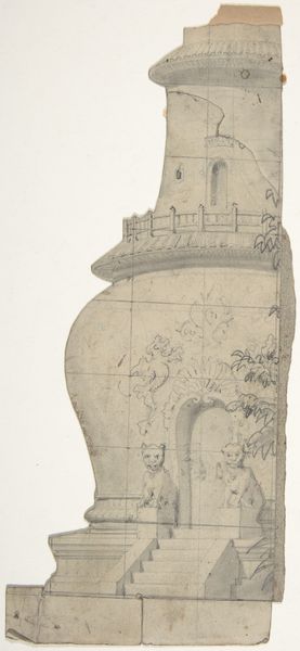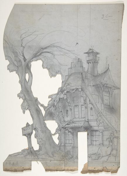 This is Eugène Cicéri’s "Design for a Stage Set at the Opéra, Paris", made with graphite and gray wash on irregular paper. The drawing presents a study in architectural forms and spatial arrangements. It appears to be an informal but precise vision for the stage. The composition employs a somewhat erratic application of graphite to depict a partial architectural structure, seemingly of classical inspiration. The texture of the paper itself, with its irregular edges, enhances the drawing's unfinished, exploratory nature. The linear quality is dominant, emphasizing the structure and its suggested depth, with hatching to model form. Cicéri has created a semiotic dance between architectural stability and scenic illusion. This tension suggests the performative nature of architecture itself. The design prompts questions about the interplay between reality and representation, function and spectacle. The raw edges of the paper challenge our conventional understanding of how space and structure are perceived.