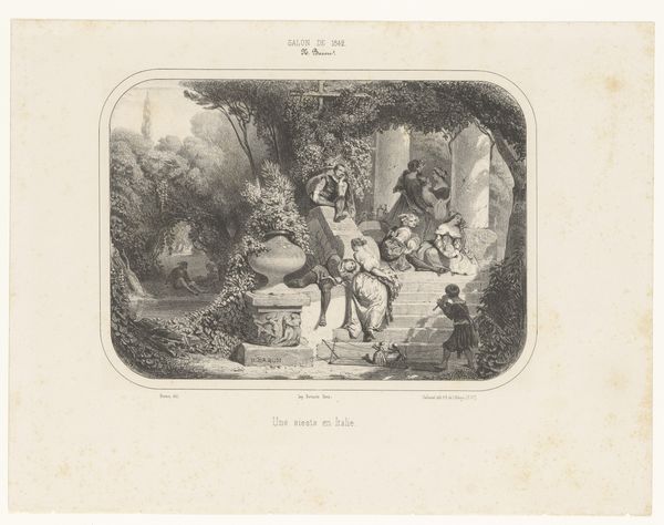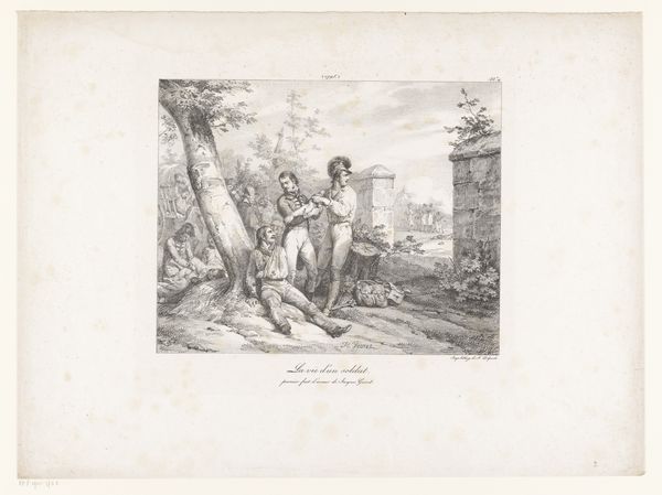 Editor: Here we have “Two Soldiers Outside an Inn,” an engraving made sometime between 1835 and 1838. It feels like a staged tableau, almost like actors waiting in the wings rather than a candid glimpse of military life. What can you tell me about it? Curator: The "tableaux" sensation you keenly observed speaks to its roots in Romanticism—a constructed emotional moment, less concerned with objective truth and more invested in evoking feeling and symbolism. The soldiers themselves, in their specific uniform, become symbols. Editor: Symbols of what, exactly? Is it about camaraderie or the cost of war? Curator: Perhaps both. Notice the setting, though: an inn. Inns have historically represented thresholds, places of transition, of meeting and parting. They also have a connotation for the lower classes, carousing, drinking and questionable behaviour. Do you notice what the soldiers might have done that gives some insights in their purpose at that moment? Editor: I do, I see broken sticks on the ground; what are those there for? Curator: It points, likely, to a game or some form of wager gone awry, where a split stick was part of an agreement, or bet, so to say. The broken sticks symbolize disrupted agreement, leading into conflict, the inn possibly a point where those events culminated, but outside into the "threshold", is the "agreement" in plain sight again? The work therefore plays on the shifting sands of human agreement, showing our willingness to turn from games, towards possible feuds. What feeling does it trigger in you to be shown those human moments in life? Editor: I suppose it makes you think about the fragility of social connections and how quickly they can fracture, doesn’t it? Curator: Precisely. And this tension, the precipice between harmony and discord, is where the image truly finds its lasting cultural weight, still relevant. Editor: That really opens up the symbolic richness of what initially seemed like a simple genre scene. Thanks for this deep analysis.