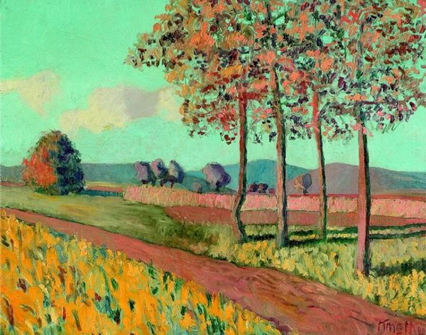 Curator: Spencer Gore's "The Cinder Path," currently residing at Tate Britain, presents a captivating vista. Editor: It feels rather muted, doesn't it? A restrained palette, suggestive of a somewhat melancholic rurality. Curator: The composition directs our gaze along the path, dividing fields through subtle shifts in color and texture. Note the contrast between the worked land and the fallow. Editor: Exactly, the land is clearly being shaped and manipulated; consider the labour implied in that cultivation, the social relations embedded in its ownership and use. Curator: The application of paint, though, is quite crucial; broken strokes create a shimmering surface, dissolving firm boundaries between forms. Editor: True, but the muted color choices speak volumes about the economic realities of rural England at the time and perhaps point to its slow progress. Curator: I see a sophisticated arrangement of form and color more than a stark social commentary. Editor: Perhaps, but it's impossible to ignore the human element etched into the landscape by tilling it in this way. Curator: A compelling painting, whichever path one chooses to analyse. Editor: Indeed, a picture full of subtleties and suggestive of the quiet toil that makes up England's landscape.