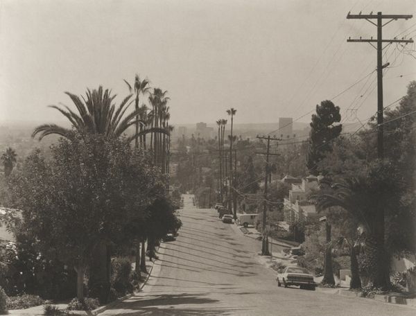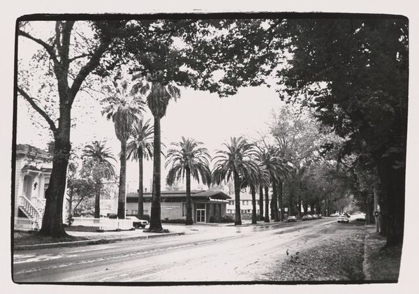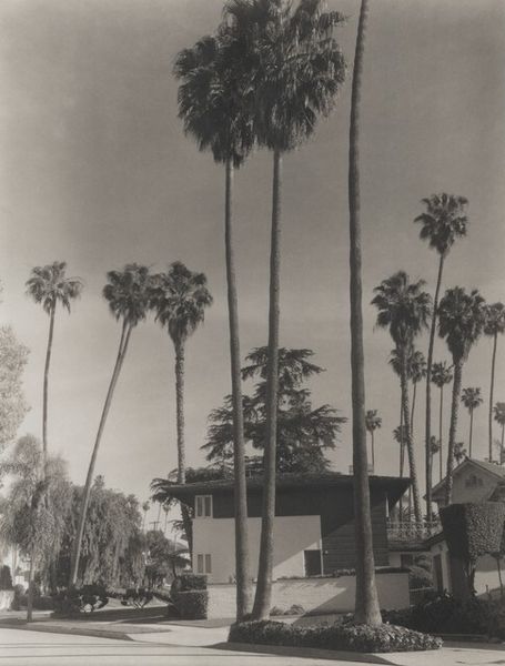 Editor: Here we have Madoka Takagi’s “Vista Del Mar (Via LAX),” a gelatin silver print from 1995. The monochrome landscape has this… melancholic feeling, almost like a forgotten postcard. What do you see in this piece? Curator: This image invites us to consider the layered meanings embedded within a seemingly straightforward landscape. As an activist lens, I immediately look to the social context of the vista, LAX airport, a hub of transit and displacement. What does it mean to frame this scene with these familiar palms against a backdrop that evokes the constant movement and perhaps even the uprooting of communities? How does that make you think about environmental justice? Editor: Well, I hadn’t really considered the location itself in that way. I was just sort of thinking about the artistic qualities of the landscape… the light, and the composition. I guess those palms could be seen as iconic markers of a romanticized California, especially in contrast to what an airport represents… transience. Curator: Exactly! The photograph performs a visual layering, inviting us to unpack how places are represented, especially in black and white. Consider how images shape perceptions of identity, particularly within racial and economic contexts. Palm trees become less a symbol of leisure and more a complex marker of geographic identity and economic disparity. Editor: So, you're saying that photography like this challenges us to think beyond surface-level aesthetics, and consider the historical and social narratives that shape our understanding? Curator: Precisely. How can we interpret the photographer's viewpoint within a place as fraught as the area around LAX? As students, it’s crucial to investigate how even "simple" monochrome landscapes can reflect deeper power structures and societal values. Editor: I see. Now that you point it out, that melancholic feeling I had gets replaced with a sense of displacement and questioning, knowing how much the airport affects surrounding neighborhoods. Curator: Absolutely! And in turn, it invites conversation beyond what meets the eye.