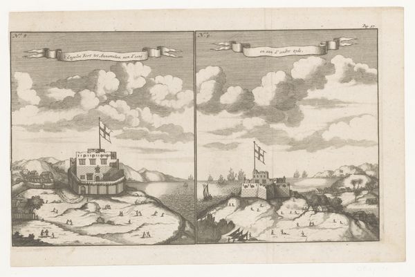 Curator: Here we have an engraving from 1709 titled "Twee gezichten op Fort James te Accra in Ghana," or "Two Views of Fort James in Accra, Ghana," by an anonymous artist. It resides in the Rijksmuseum. Editor: The scene has an oddly serene quality, despite its subject. The neatly arranged figures, the crisp architectural lines, even the billowing clouds lend it a rather static feeling. And yet...there’s a disquiet lingering underneath. Curator: The image presents two perspectives of Fort James, both under the Dutch flag, although the fort was originally established by the English. What visual symbolism do you see at play? What story can we weave through it? Editor: We see figures populating the landscape—are these soldiers? Captives? They seem small, inconsequential compared to the fort. The presence of the Dutch flag, even without knowing the specifics, points toward themes of colonial power, control, and the subjugation of people. This is a landscape soaked in history, a silent testament to human suffering. Curator: Absolutely, these symbols speak of power. The Fort itself represents dominion, of course, and even in its depiction in both images there is a symbolic contrast that the engraver makes so clear. And consider the perspective! Each viewpoint suggests an angle of control and ownership. I believe the serenity is more akin to forced submission rather than peace. Editor: I wonder about the choice to render this scene as two nearly identical landscapes. What effect is produced by repeating an image? And each image also includes what appears to be a separate title written on fluttering ribbon banners in early modern Dutch! Curator: Well, recall that maps and topographical images in the early 18th century functioned as tools of power and persuasion. Duplicating and contrasting fortresses—through the banner texts—could also subtly underline the might of European empires, the expansionist spirit. In its time, images like these were not passive reflections; they actively contributed to constructing a particular narrative about colonisation. The duplication allows for the reading of the symbolic inscriptions overhead each fortress view. Editor: I agree completely, particularly in this case; such historical records give shape to how we perceive cultural dominance, and our responsibilities to decolonize that memory by engaging actively with its inherent contradictions. Curator: An engaging discussion indeed. The image’s composition offers a seemingly tranquil surface that actually shrouds an undeniable demonstration of imperial ambition and lasting social inequity.