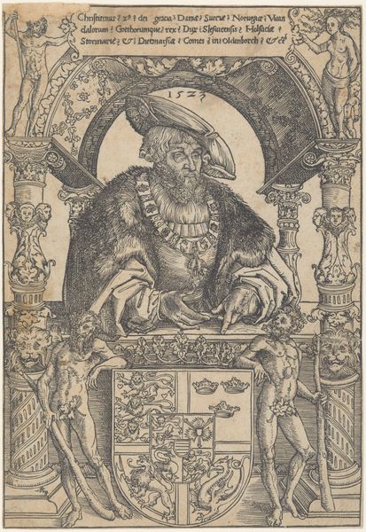 Curator: Here we have "A Man Standing by a Heraldic Shield," a drawing attributed to the workshop of Hans Baldung Grien. It’s a study of sorts, measuring about 24 by 21 centimeters. Editor: There's something unsettling about the figure's gaze, a melancholy weight. Is it the unfinished heraldic shield, suggesting a lineage unfulfilled? Curator: One could read it that way. The composition directs our eye to the shield's blankness, framed as it is by architectural elements and the figure himself. It's a void, isn't it, pregnant with potential meaning. Editor: It reminds me of a stage set, where the main act is yet to begin, but the players are already in position, weighed down by their roles. Curator: Indeed, and note the restrained use of line and wash, creating a tonal harmony, which reinforces the overall mood of contemplative anticipation. Editor: An anticipation, perhaps, tinged with anxiety. One wonders what arms will eventually fill that shield—or if it will remain forever empty, a silent question mark. Curator: Precisely, and the beauty lies in that ambiguity. Editor: Yes, a beautiful, poignant silence.
